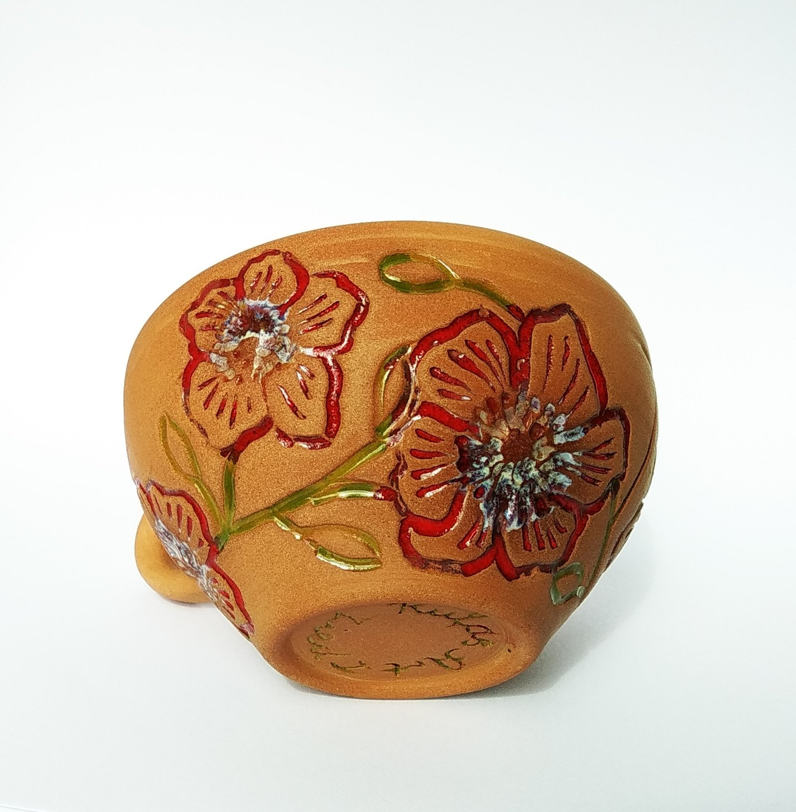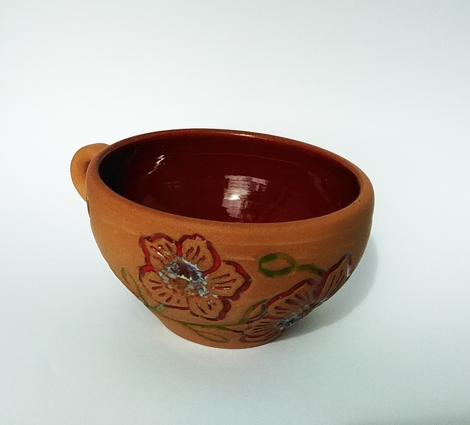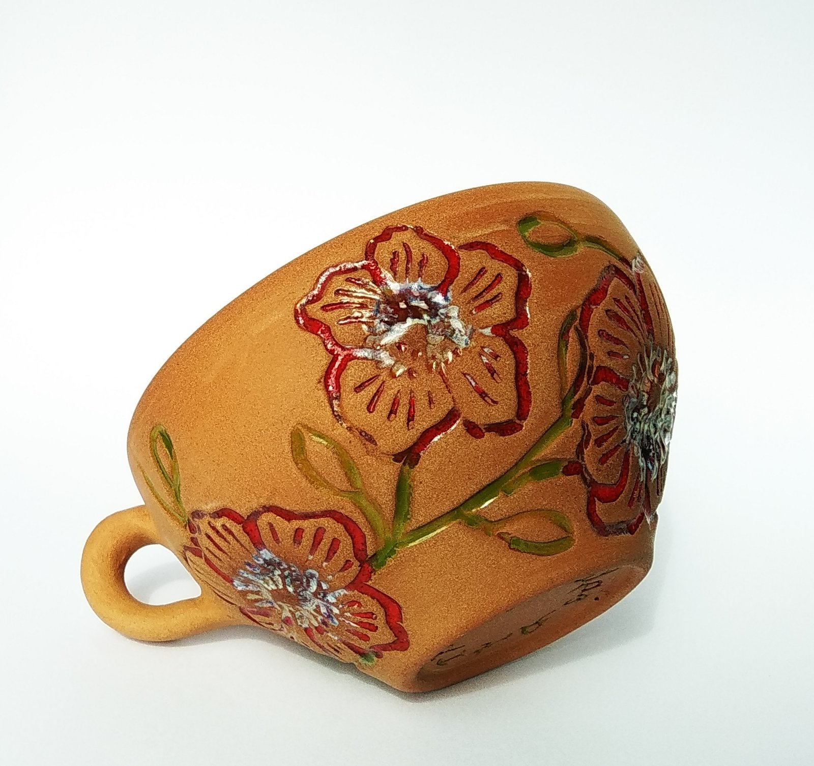 Embrace the charm of artisanal craftsmanship with this beautifully hand-painted terracotta mug, featuring vibrant floral motifs. Its warm, earthy tones and glazed interior make it perfect for enjoying your favorite beverage in rustic style.