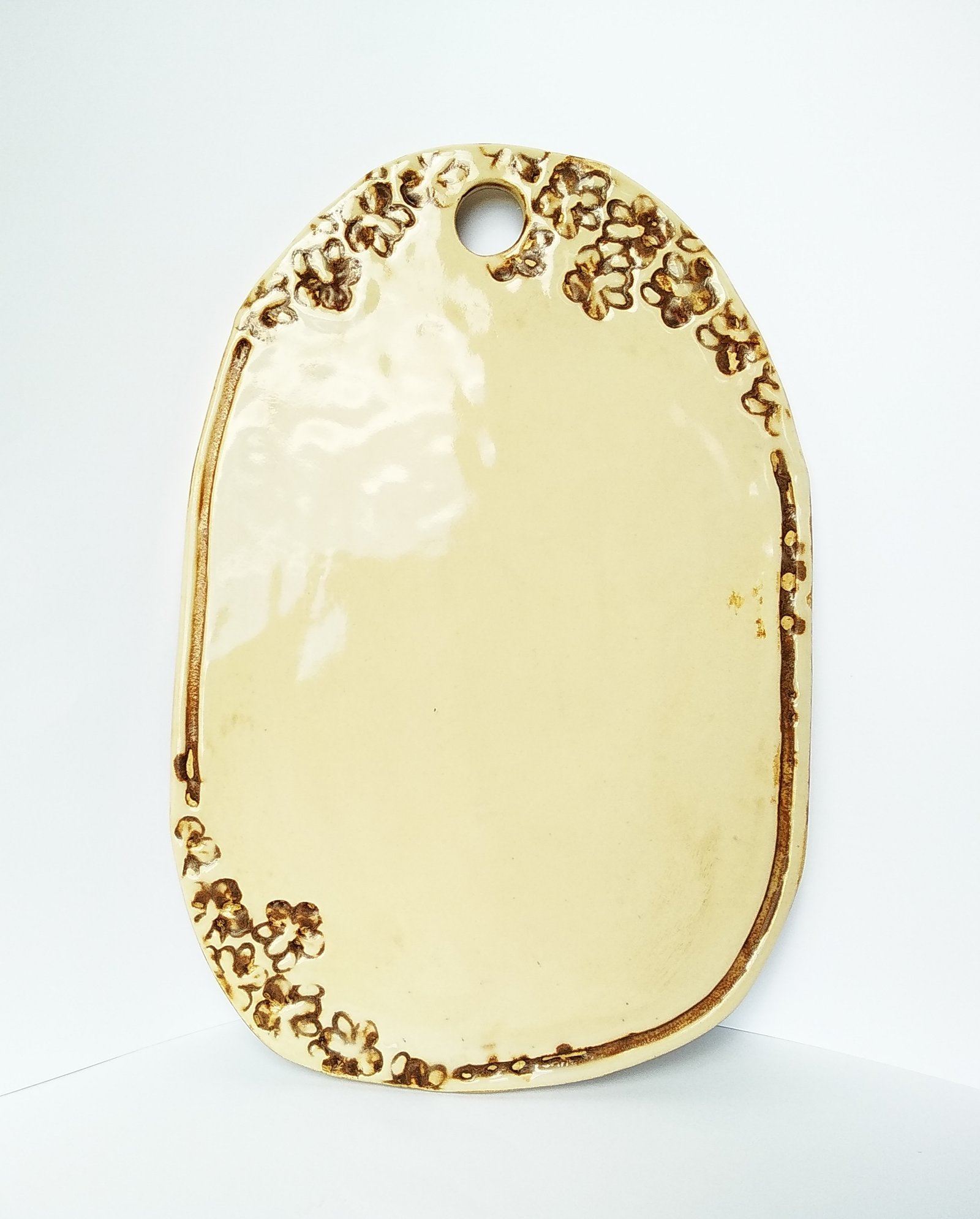 Serve your appetizers and cheeses on this charming artisan board, featuring a warm cream glaze and delicate floral imprints. Its organic oval shape and convenient hanging hole make it both functional and a beautiful decorative piece for any home.