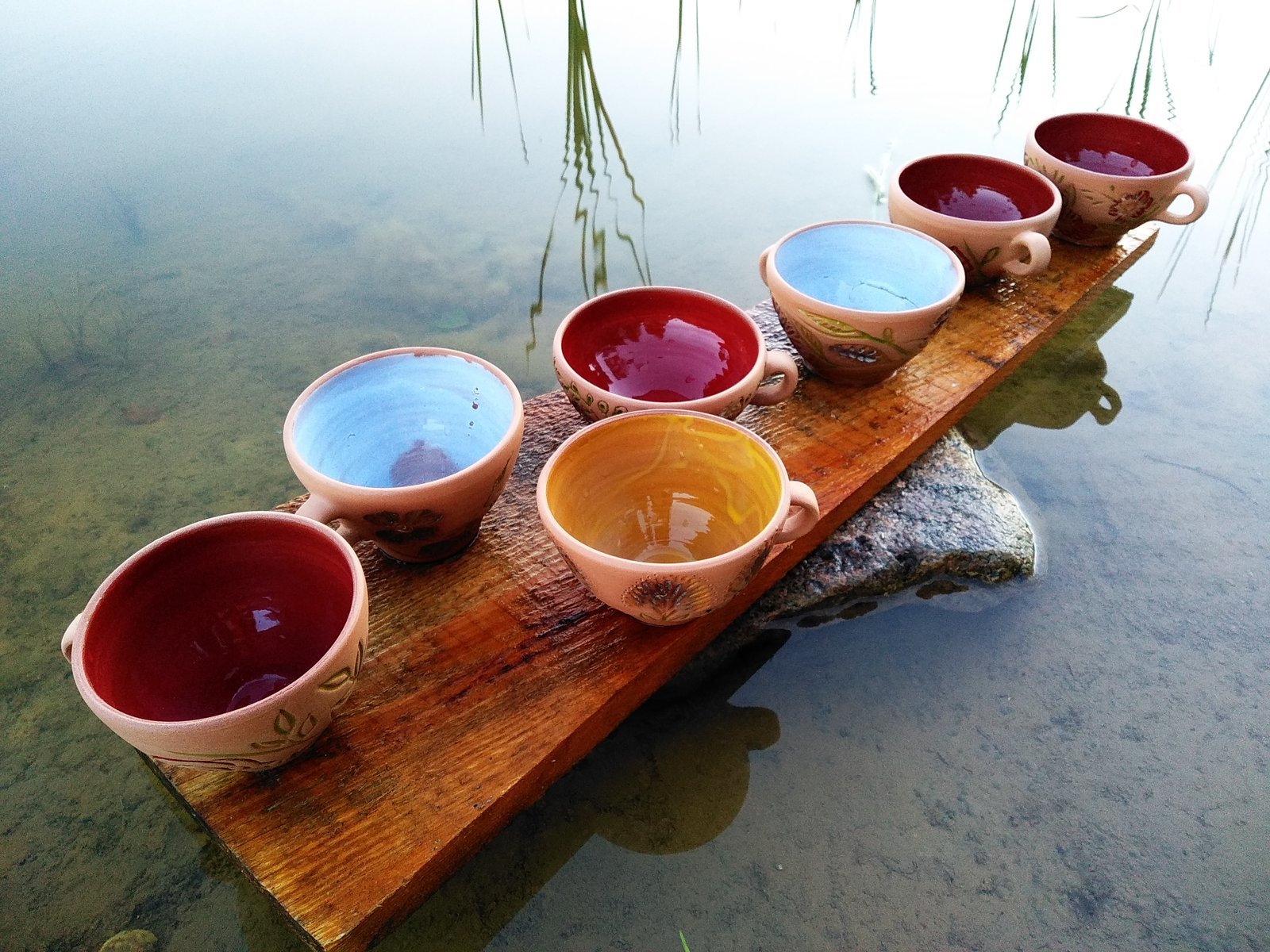 Discover the charm of nature with these beautifully handcrafted earthenware cups, each featuring unique carved patterns on its natural clay exterior. The vibrant, glossy interior glaze offers a delightful contrast, perfect for your favorite beverage.