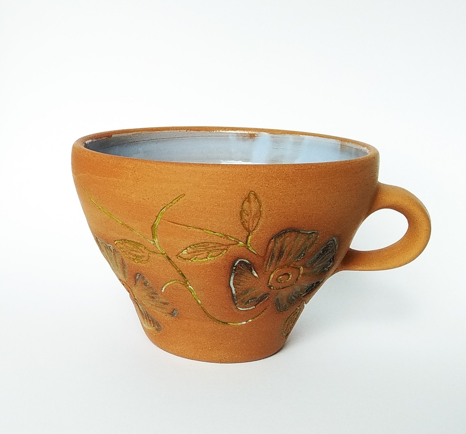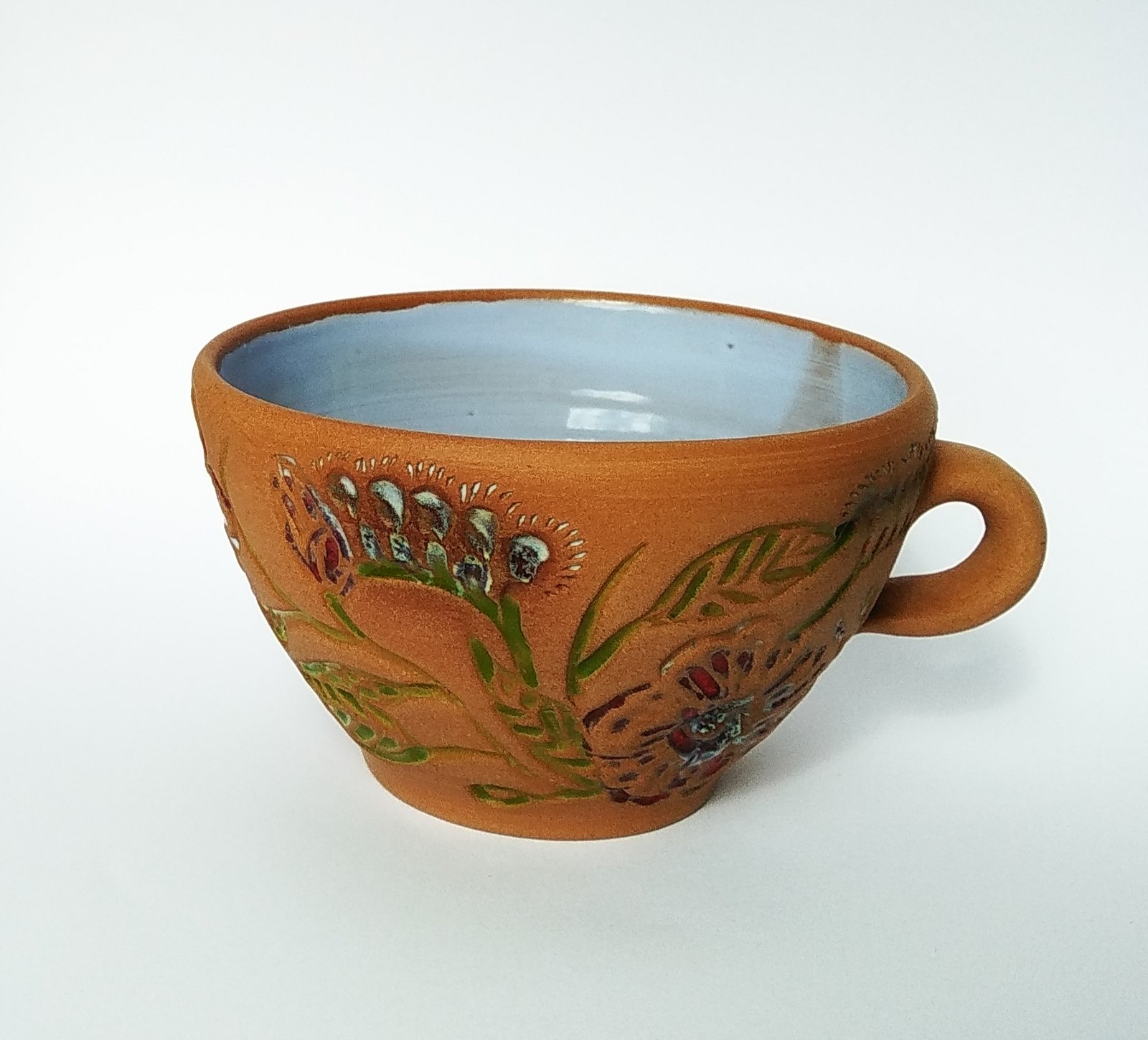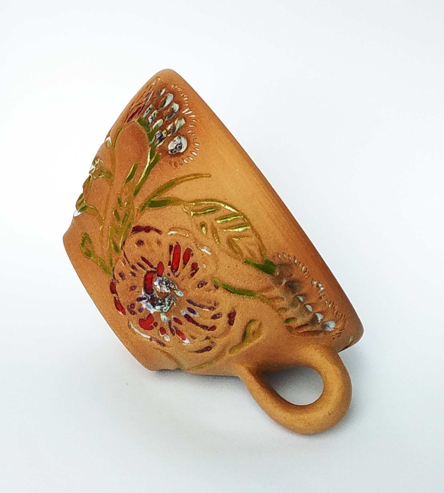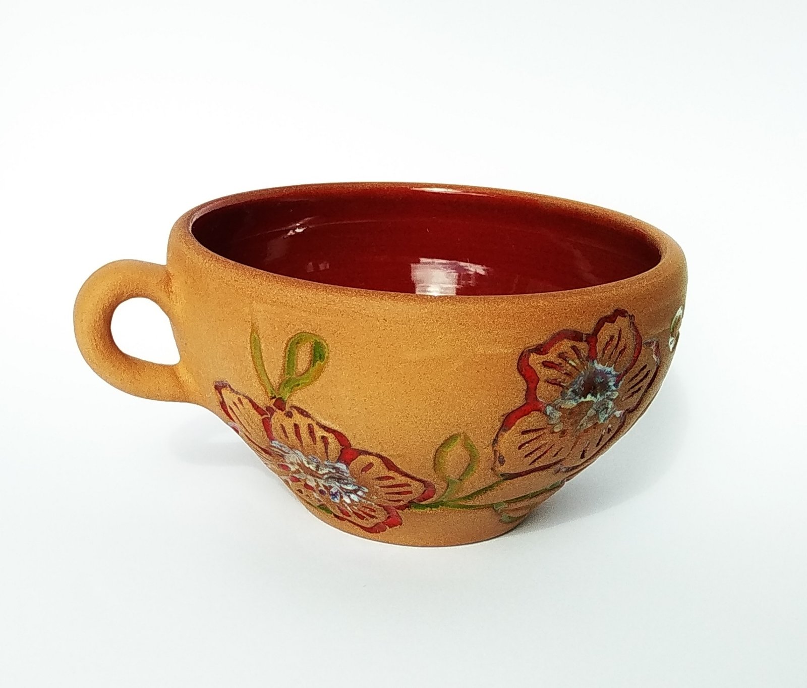 Sip your favorite beverage from this charming handcrafted terracotta mug, adorned with vibrant hand-painted floral motifs. Its rustic appeal and unique design make it a perfect gift or a delightful addition to your kitchenware collection.