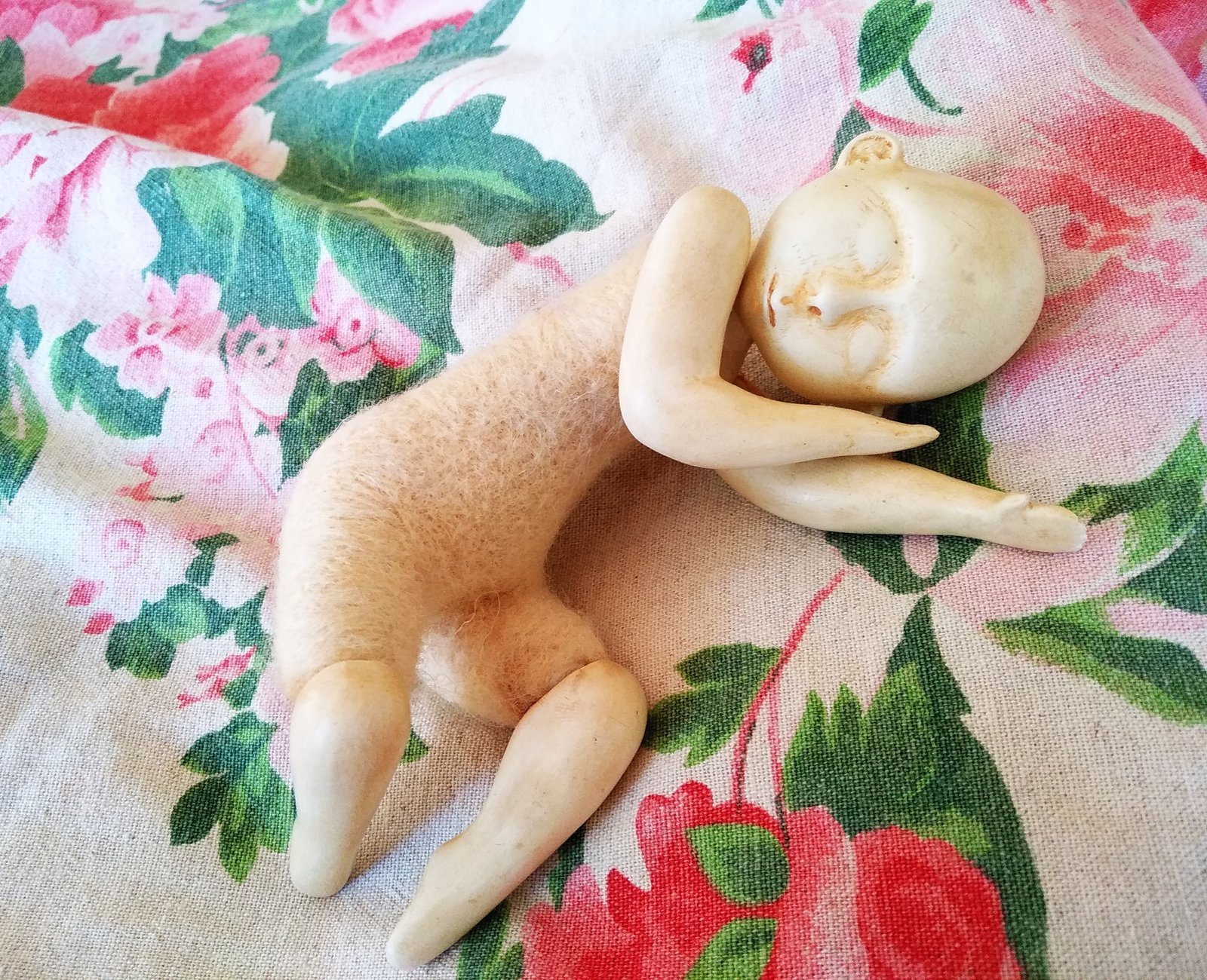A whimsical art doll featuring meticulously crafted ceramic head and limbs, cradling a soft, felted body. Resting peacefully amidst a vibrant floral backdrop, this piece evokes a serene dreamscape and artistic charm, perfect for collectors.