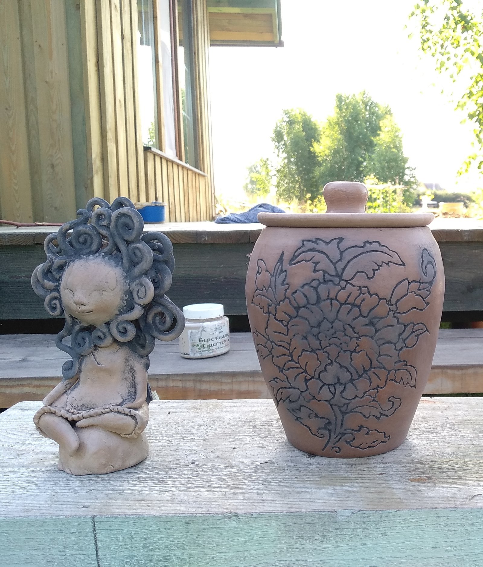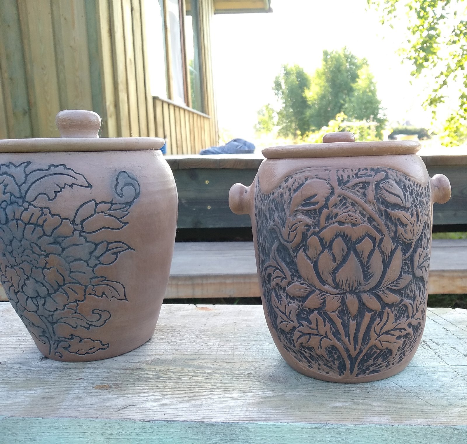 Adorn your space with this rustic, hand-carved jar. The earthy tones and botanical designs will add a touch of nature-inspired charm to any room.