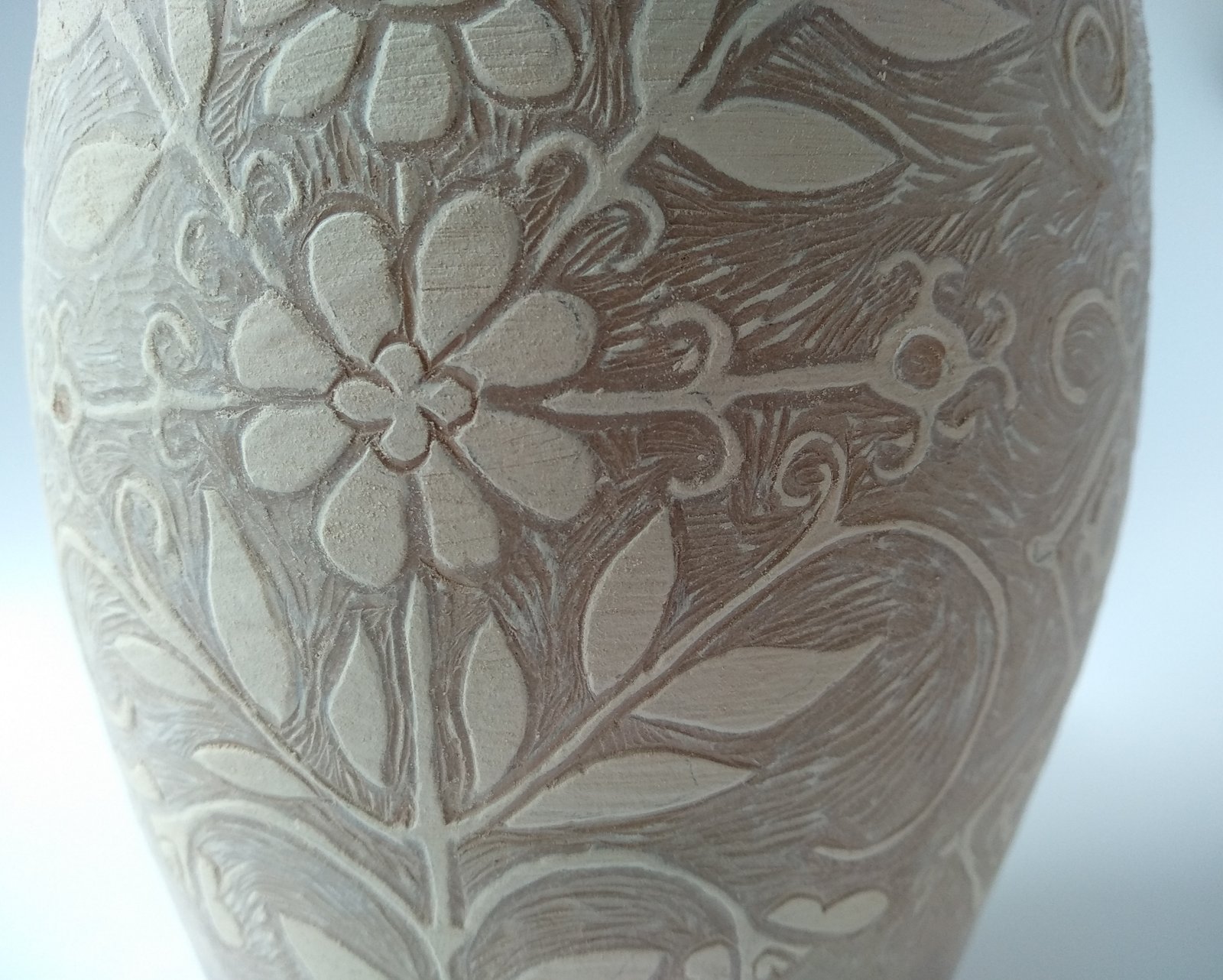 This charming vase features a delicate floral design carved into a neutral beige surface. Perfect for displaying your favorite blooms or as a standalone decorative piece.