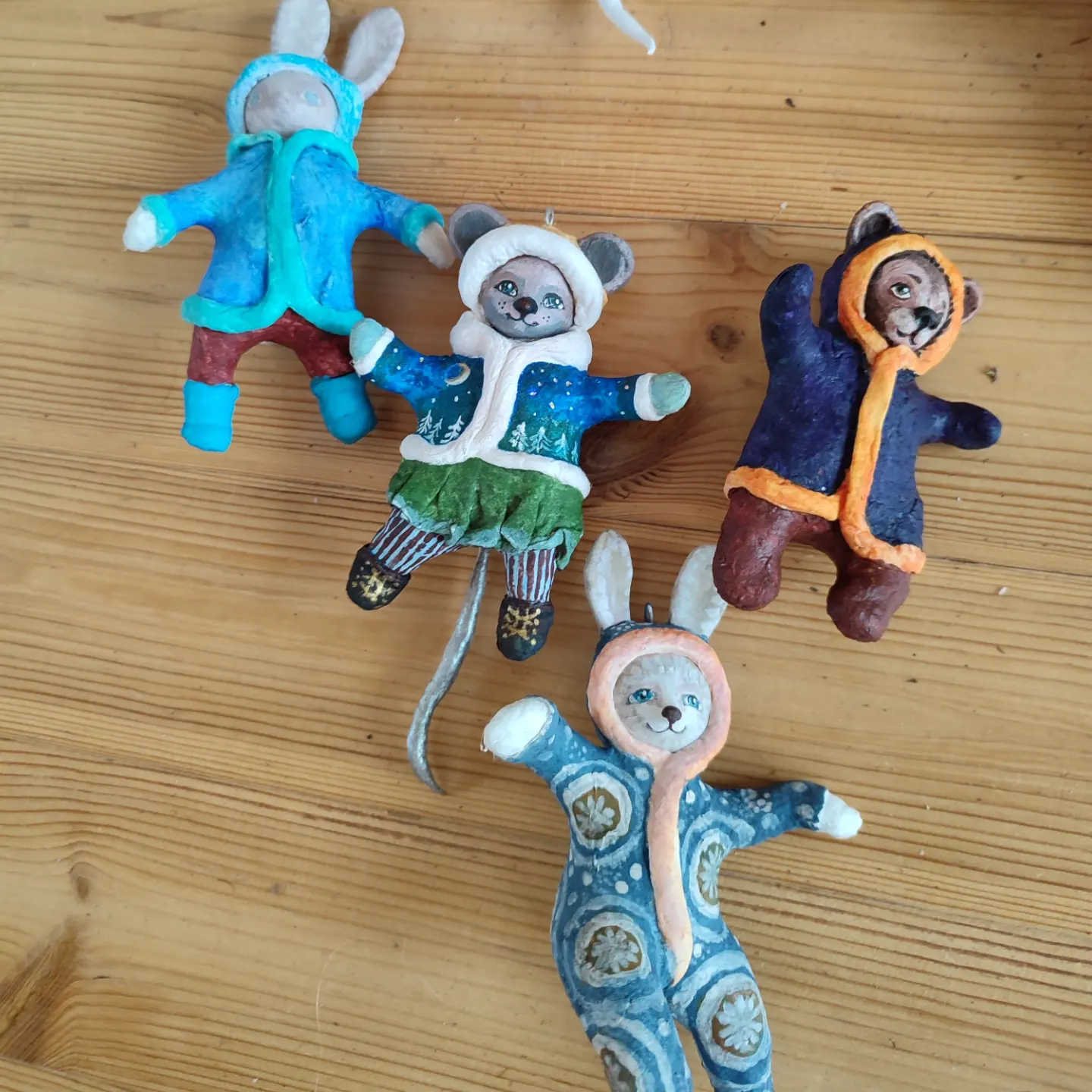 This delightful handcrafted mouse ornament, dressed in a festive winter coat and skirt, brings whimsical charm to any space. Meticulously painted with vibrant blues, greens, and white, it’s perfect for holiday decorating or year-round display.