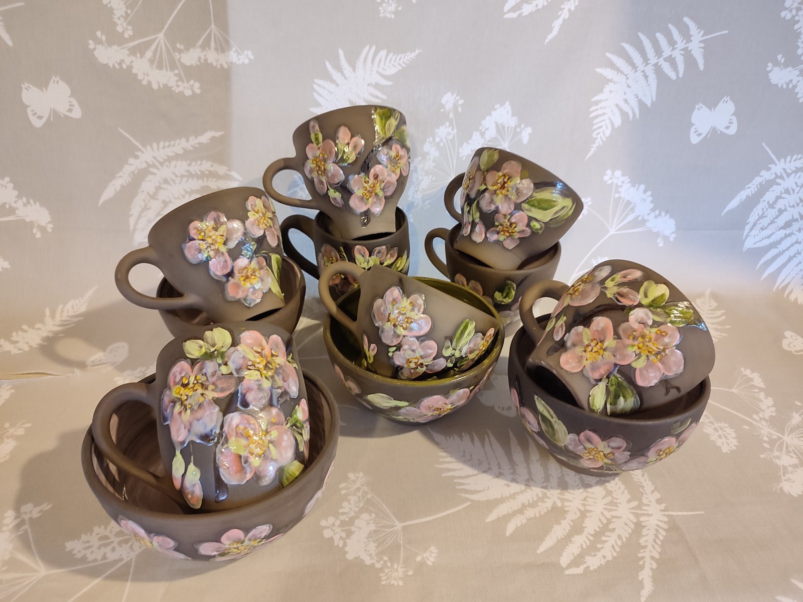 This enchanting hand-painted pottery set brings the serene beauty of a cherry blossom meadow to your table, featuring delicate raised floral designs on a warm, earthy brown base. Perfect for a cozy tea time or serving snacks, each piece is crafted to infuse your moments with charm and a touch of nature’s artistry.