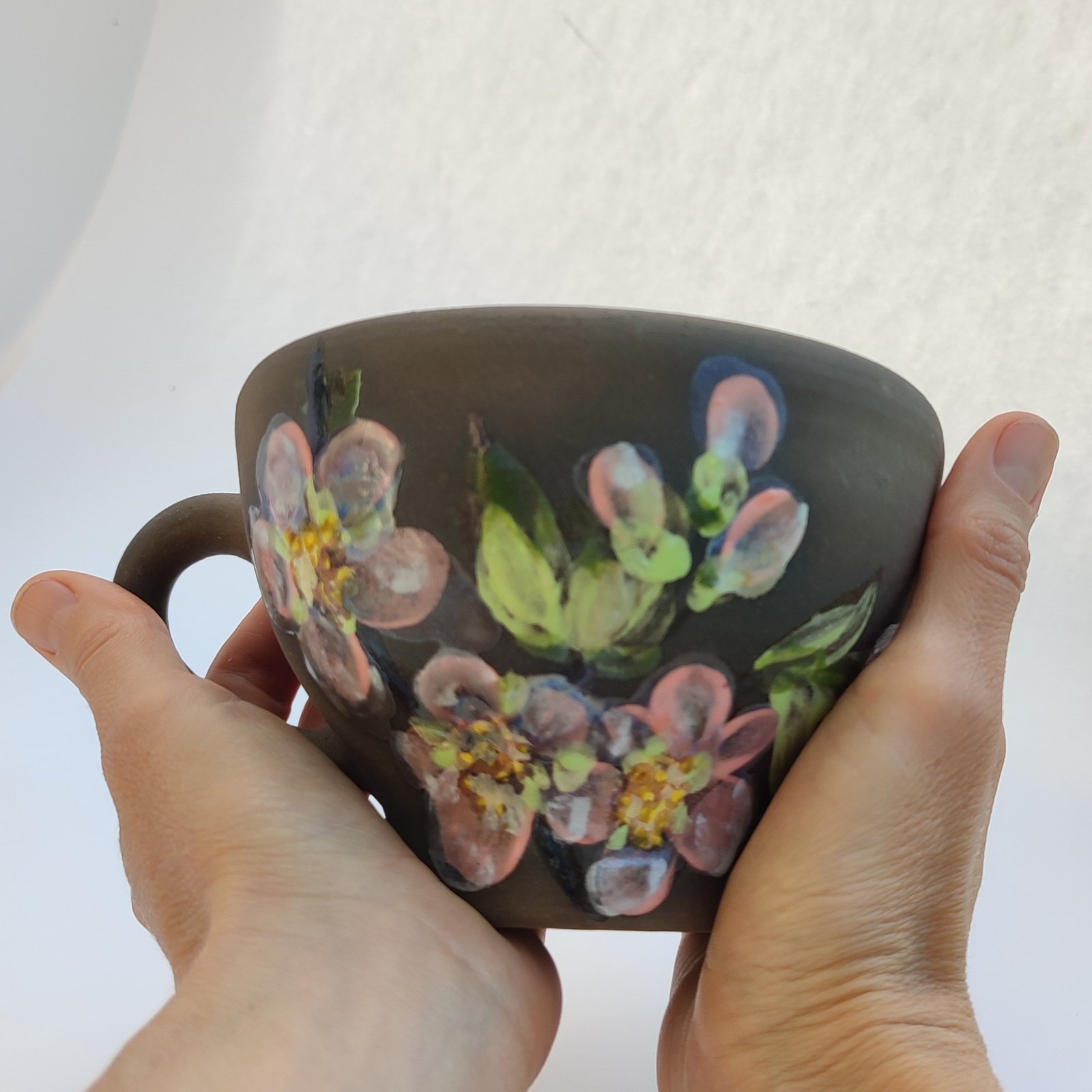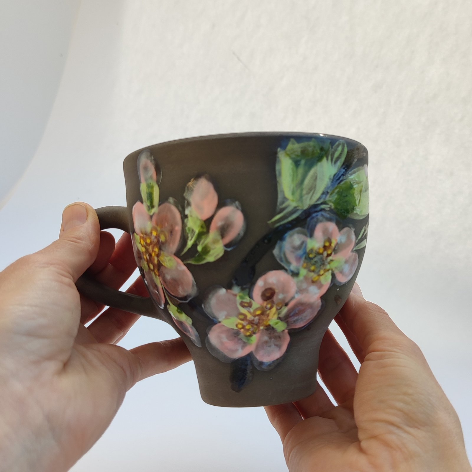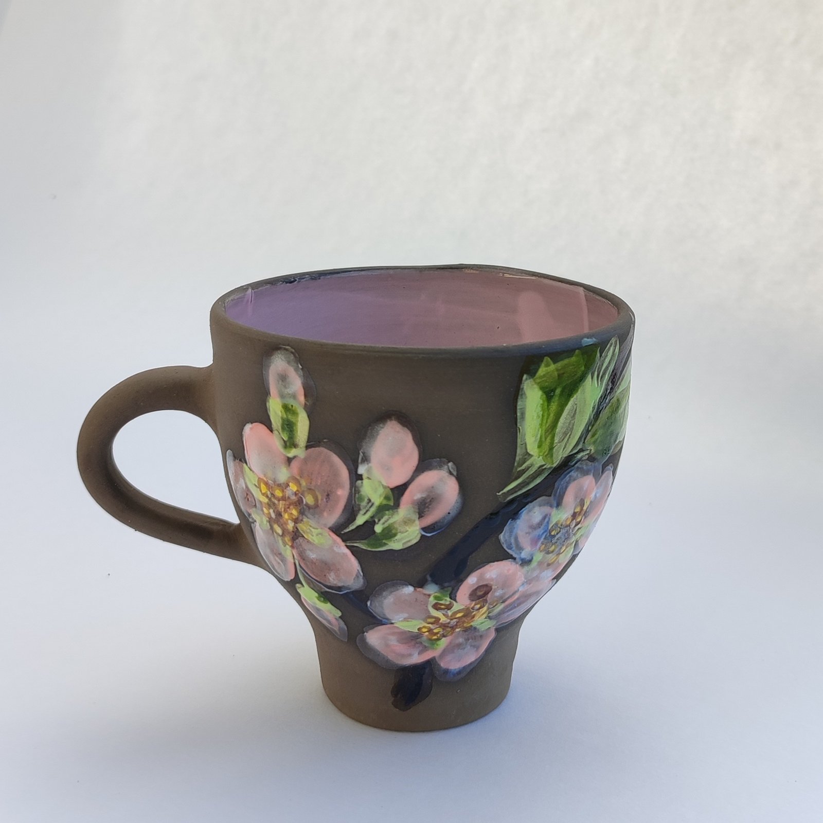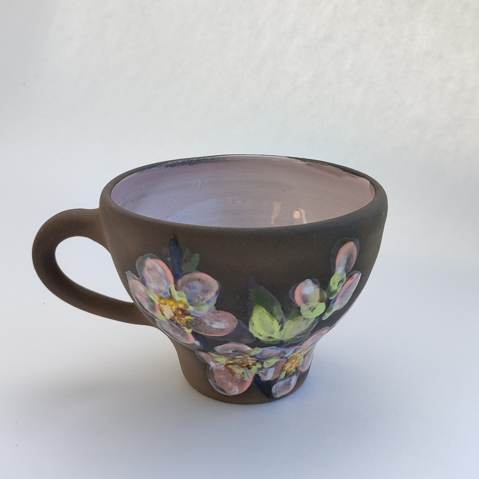 Start your day with a touch of nature with this exquisite hand-painted mug. Its dark brown exterior provides a striking canvas for the delicate pink cherry blossoms, while the soft pink interior adds a subtle charm to your favorite beverage.