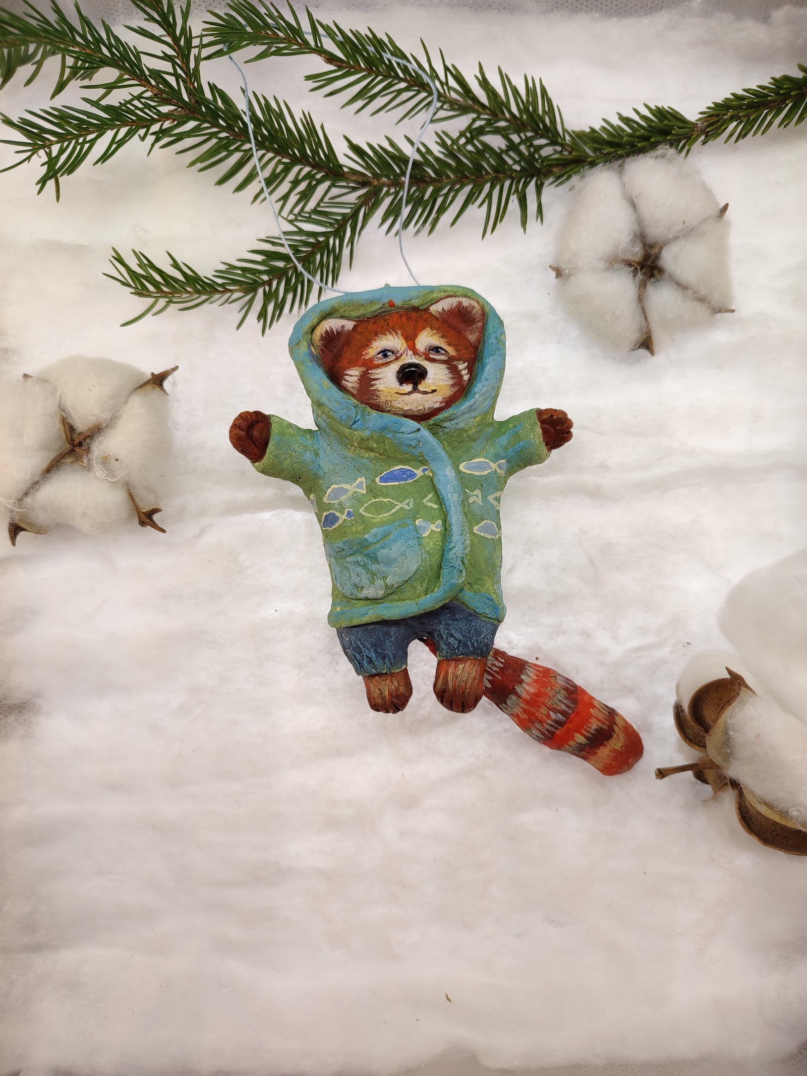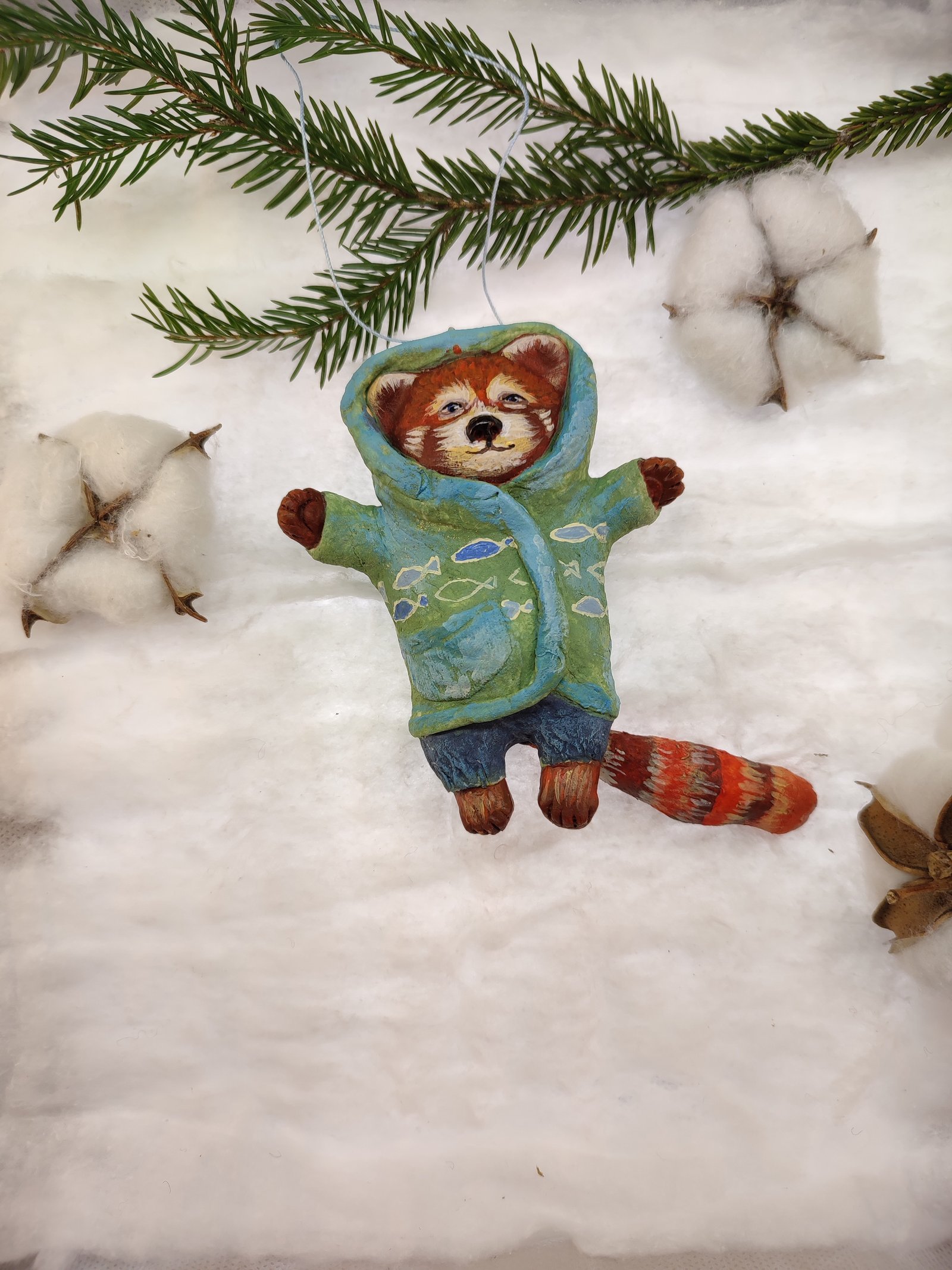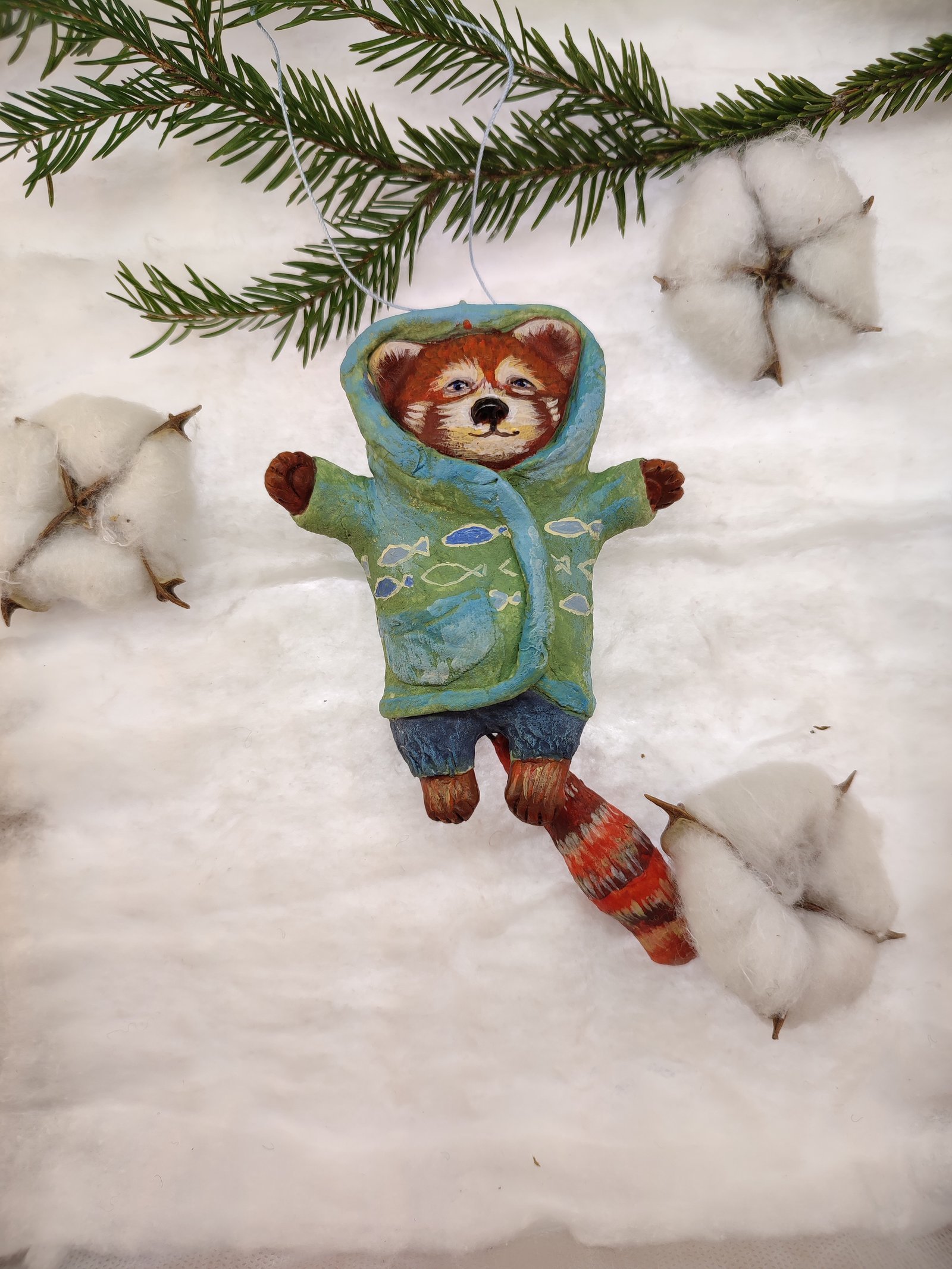 Add a touch of playful charm to your decor with this adorable red panda ornament, bundled up in a cozy hoodie. Hand-painted with vibrant colors, it’s a delightful piece for gifting or adorning your festive tree or rustic home.