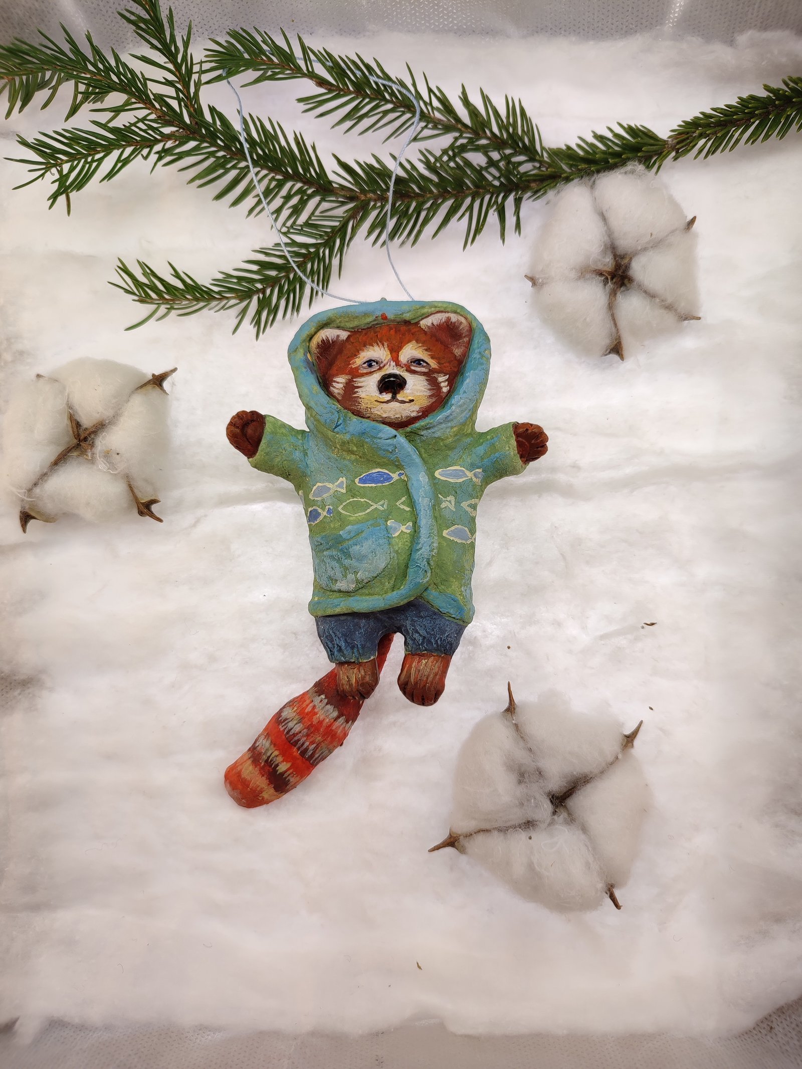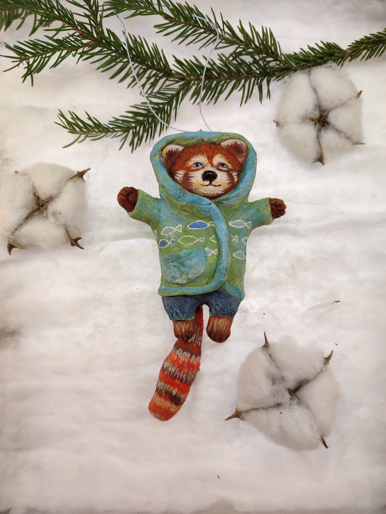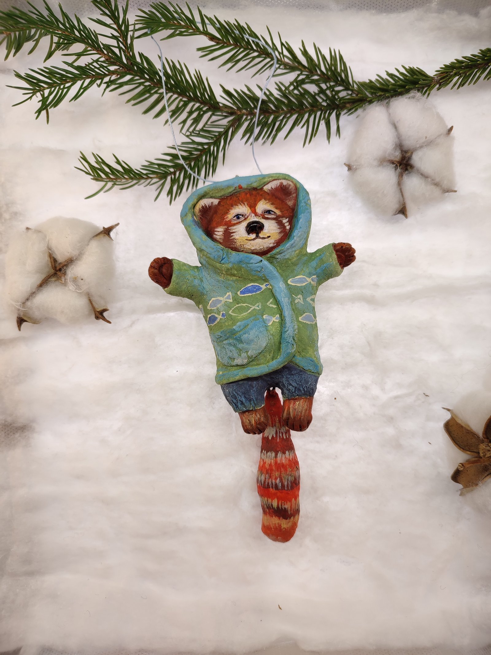 Add a touch of playful charm to your decor with this adorable red panda ornament, bundled up in a cozy hoodie. Hand-painted with vibrant colors, it’s a delightful piece for gifting or adorning your festive tree or rustic home.