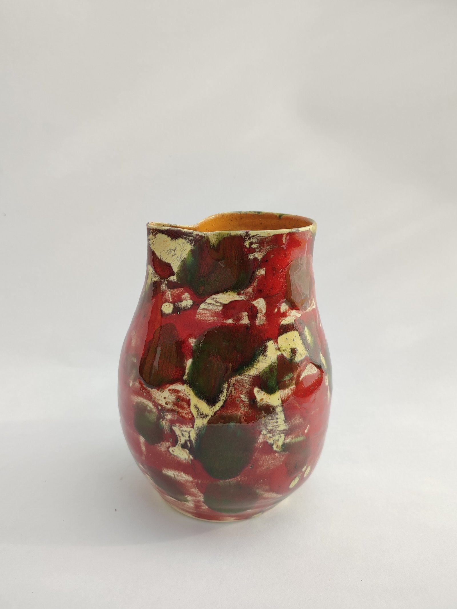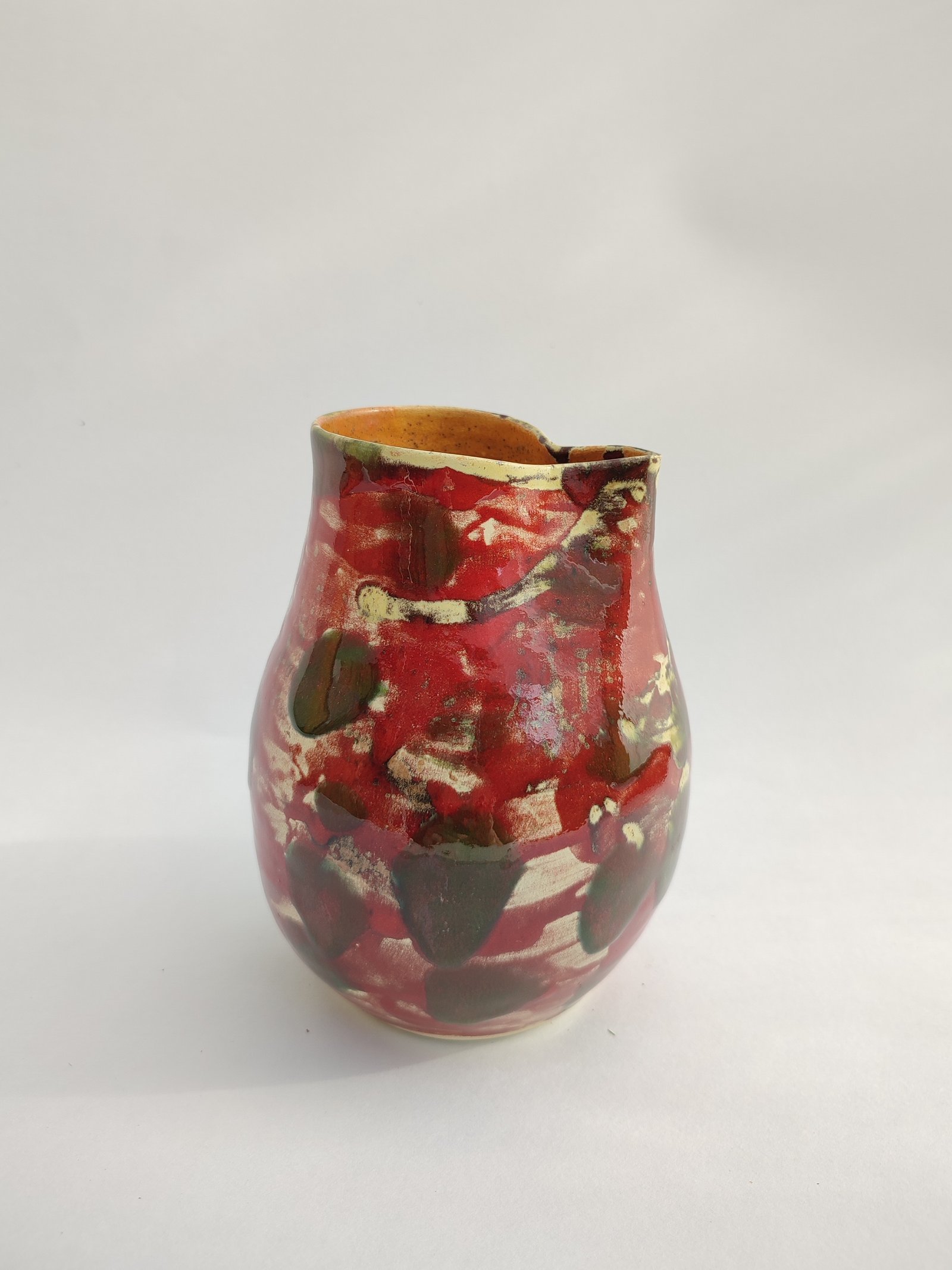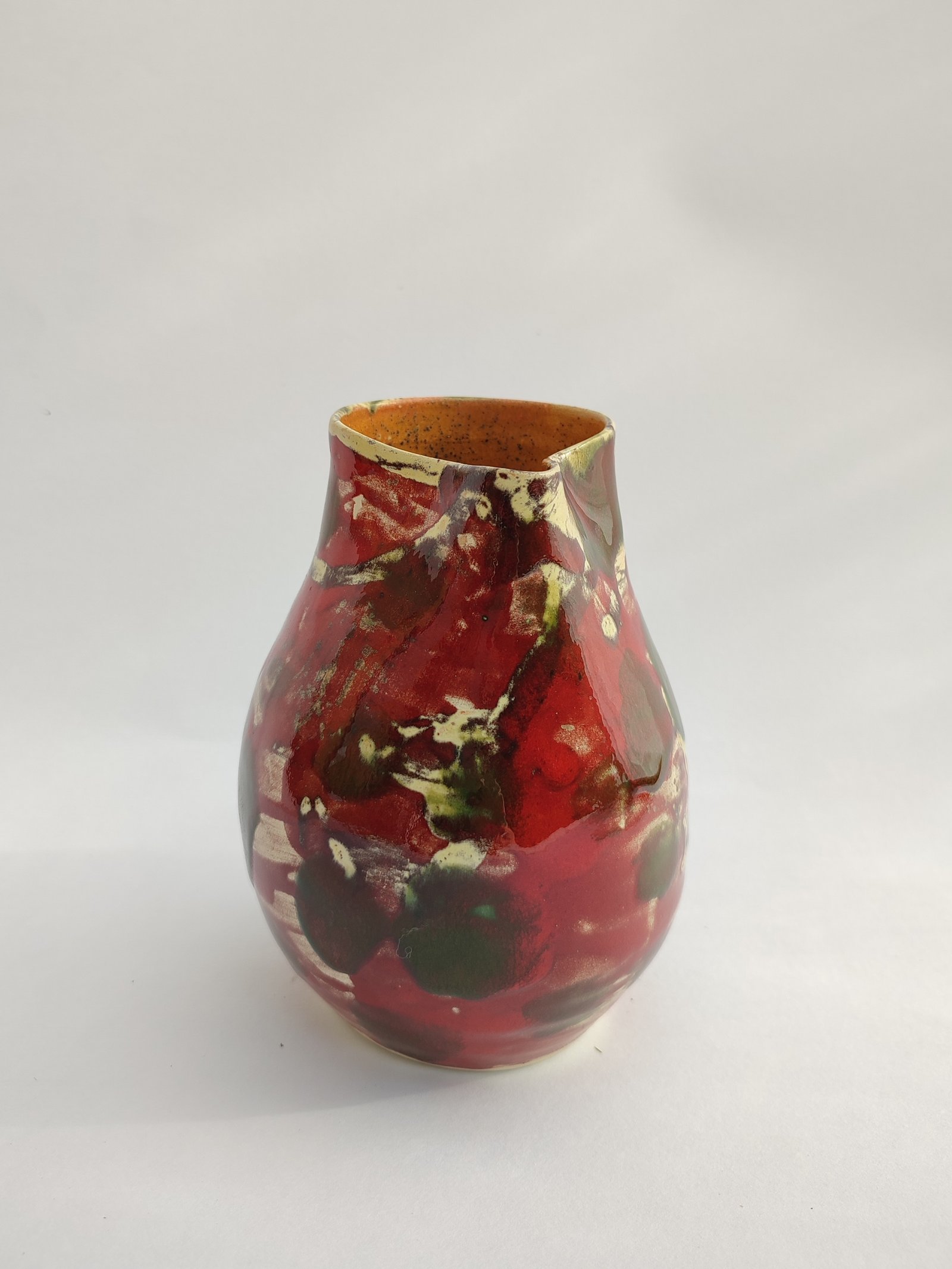 Embrace the wild beauty of nature with this unique vase, featuring an abstract glaze of deep crimson, forest green, and creamy yellow. Its organic pattern and artistic form make it a striking centerpiece for any modern or rustic decor.