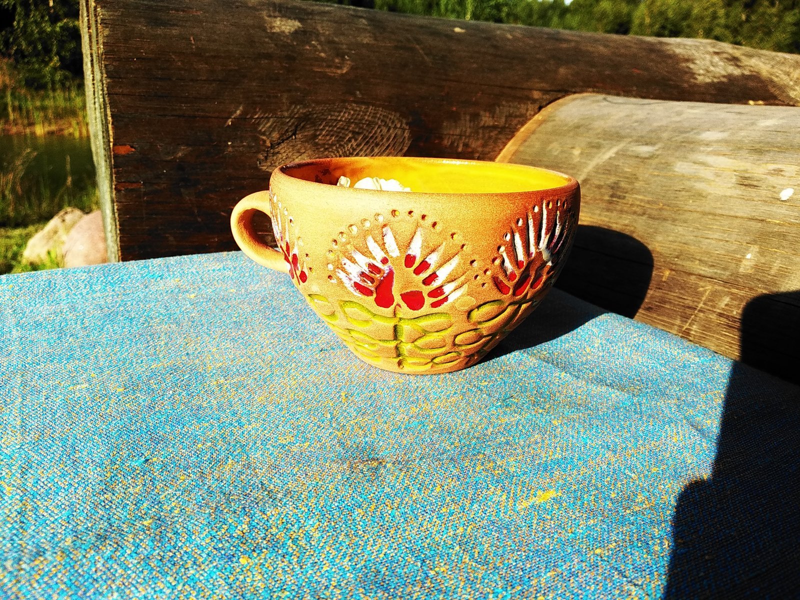 This unique mug features an earthy orange base glaze adorned with vibrant red and white handprint-like patterns, bringing a touch of folk art charm to your daily ritual. Its sturdy build and warm hues make it perfect for enjoying your favorite beverage on a cozy morning.