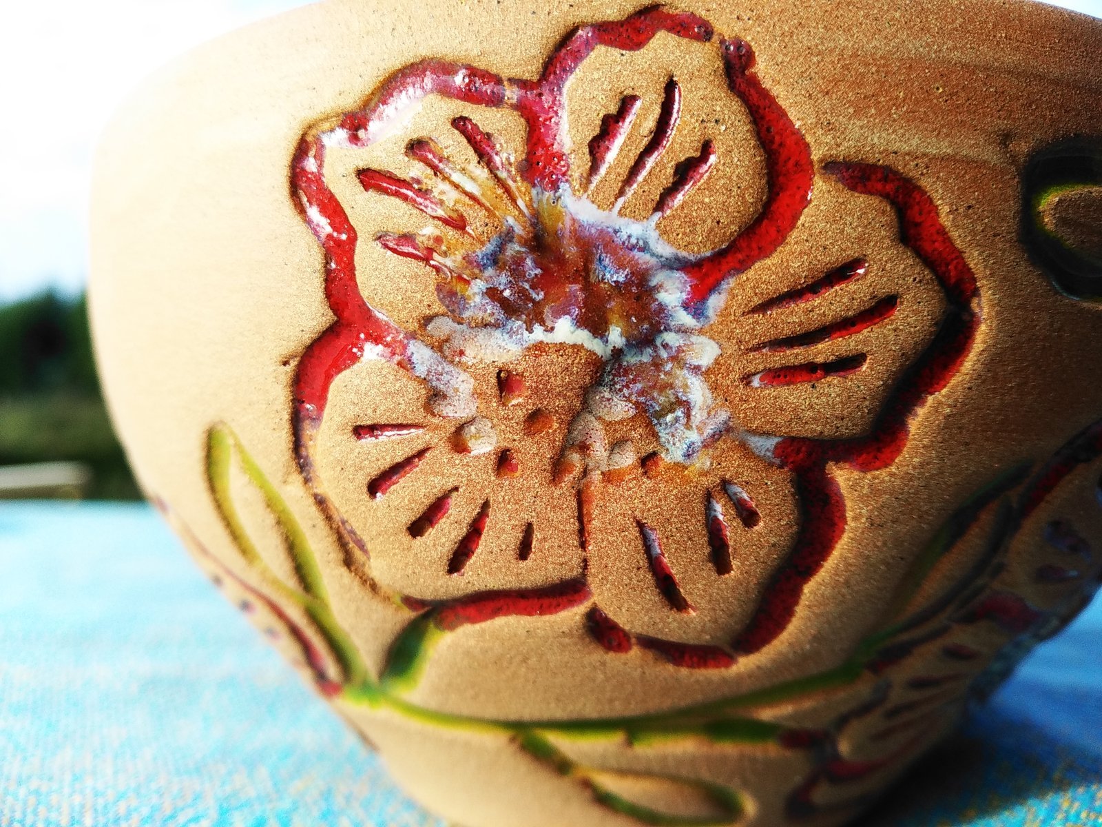 Embrace the rustic charm of nature with this beautifully handcrafted terracotta bowl, featuring vibrant carved floral designs. Perfect for serving small dishes or adding a touch of earthy elegance to any space.