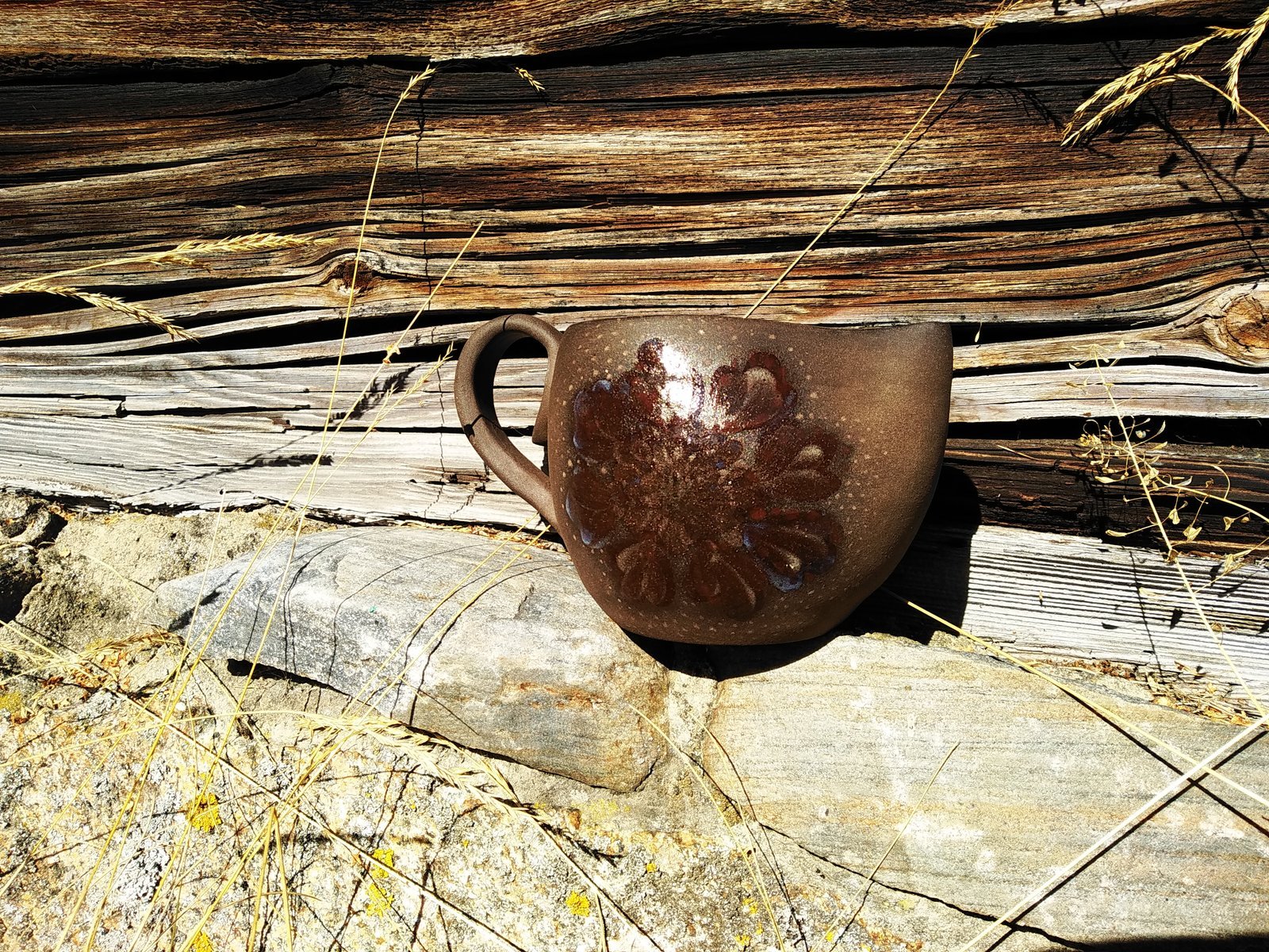 This charming mug features a rich, earthy brown glaze adorned with a striking floral design in a darker, glossy finish. Perfect for enjoying your morning coffee or an evening tea, it brings a touch of rustic elegance to any setting.