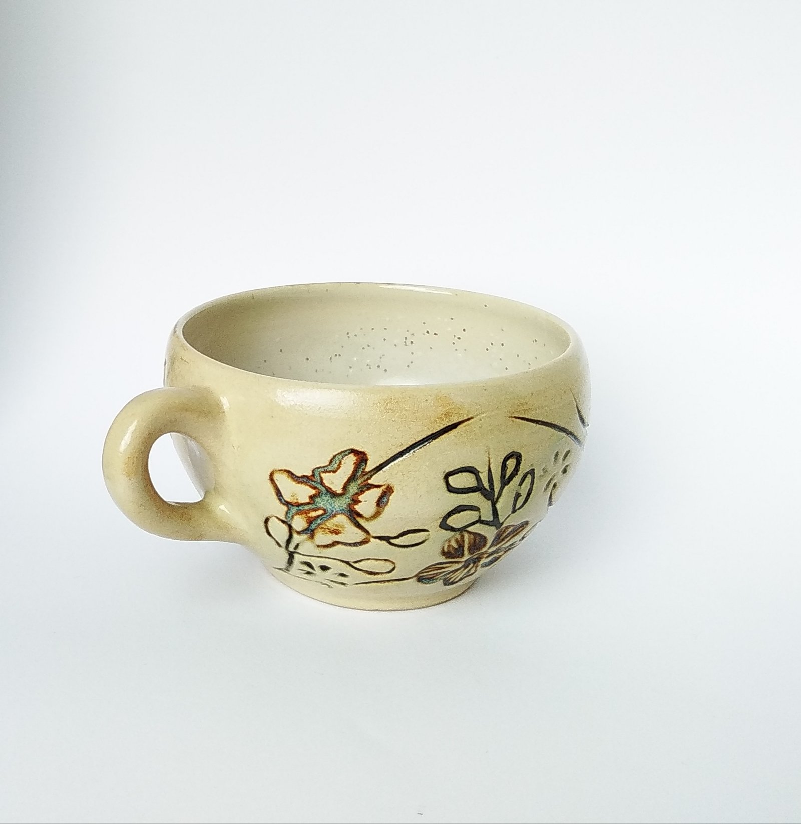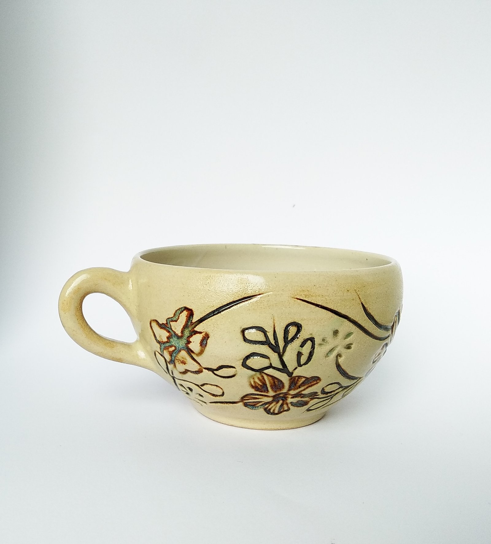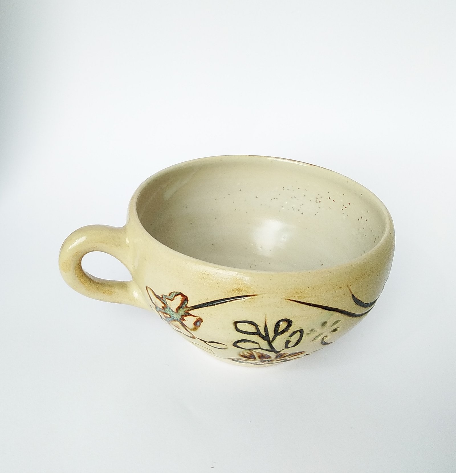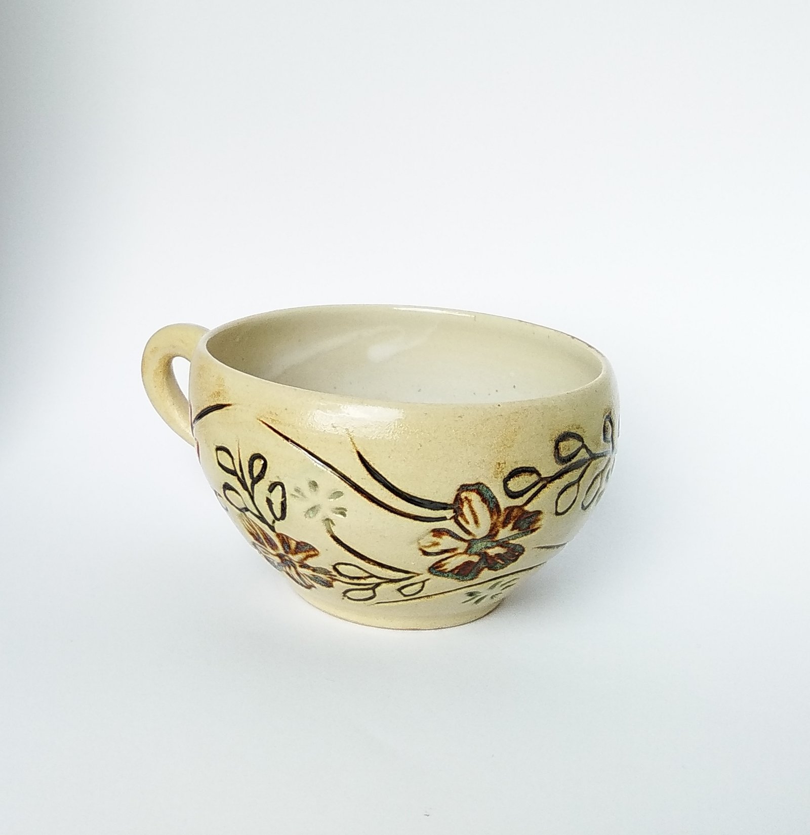 Sip your favorite soup or warm beverage from this charming, handcrafted bowl, featuring an inviting rustic design. Adorned with delicate, hand-painted floral and leaf motifs, it brings a touch of natural beauty and comfort to your daily routine.