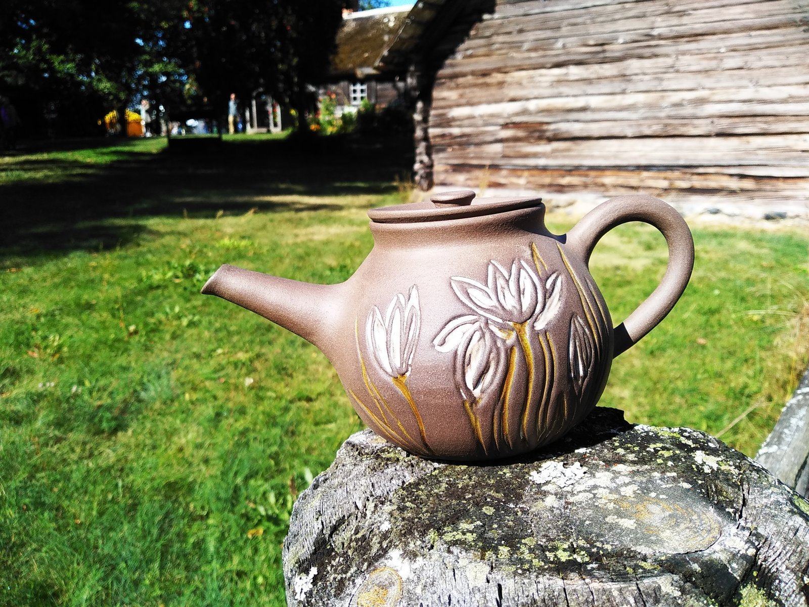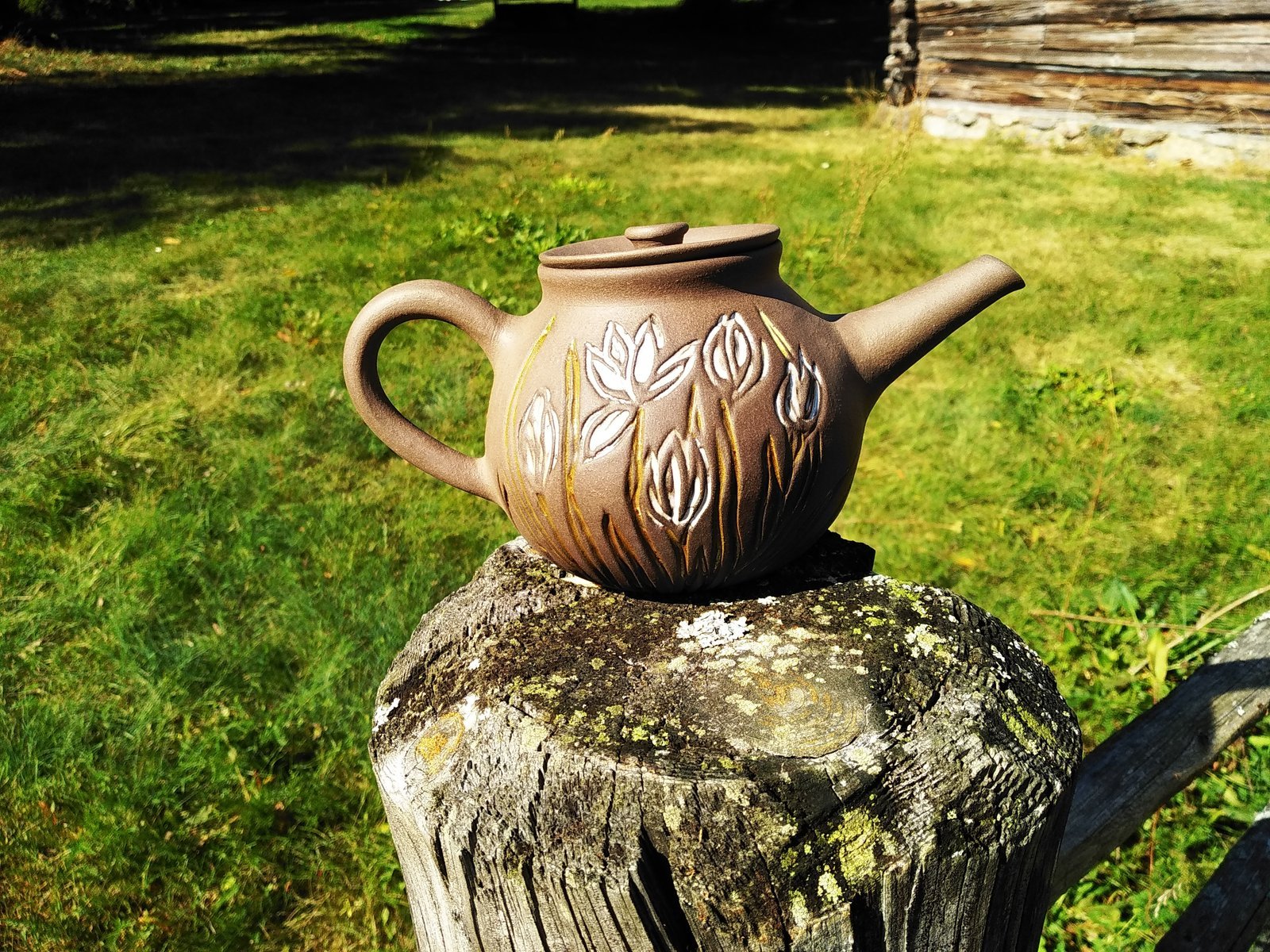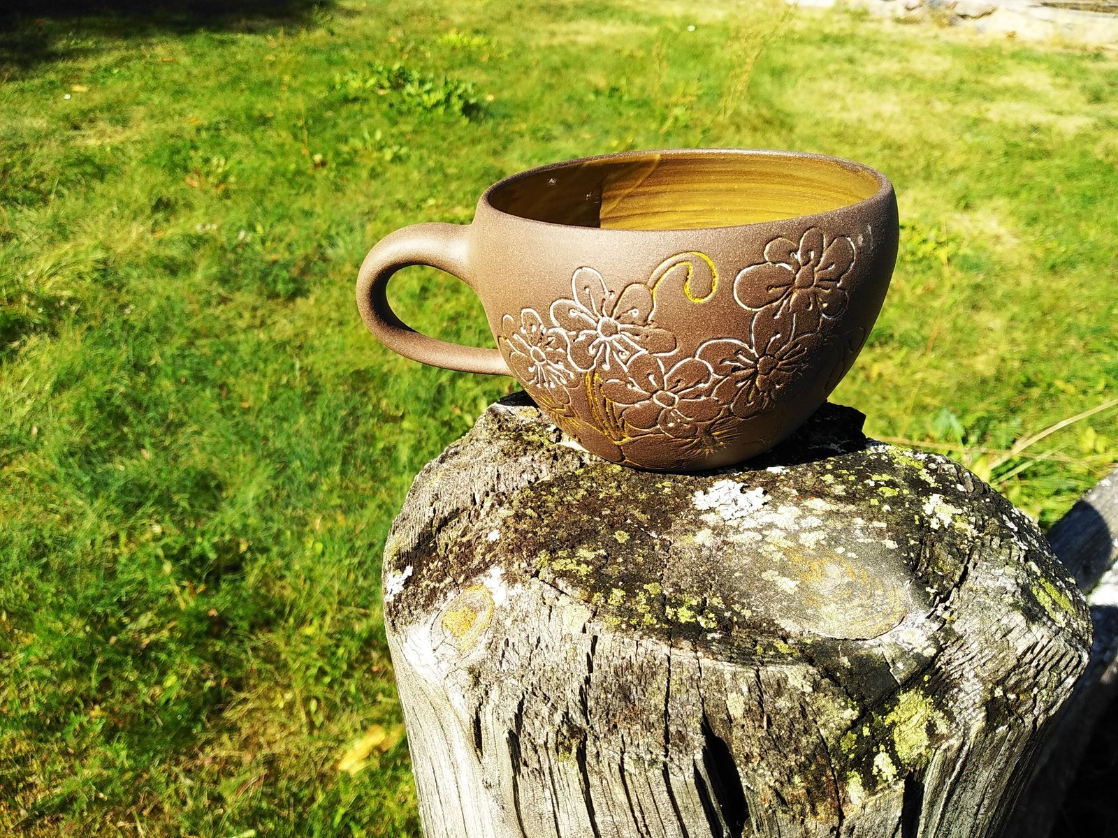 Crafted with intricate embossed floral details, this rustic mug brings a touch of nature to your daily routine. Its warm brown tone and subtle gold accents make it a charming piece for any home.