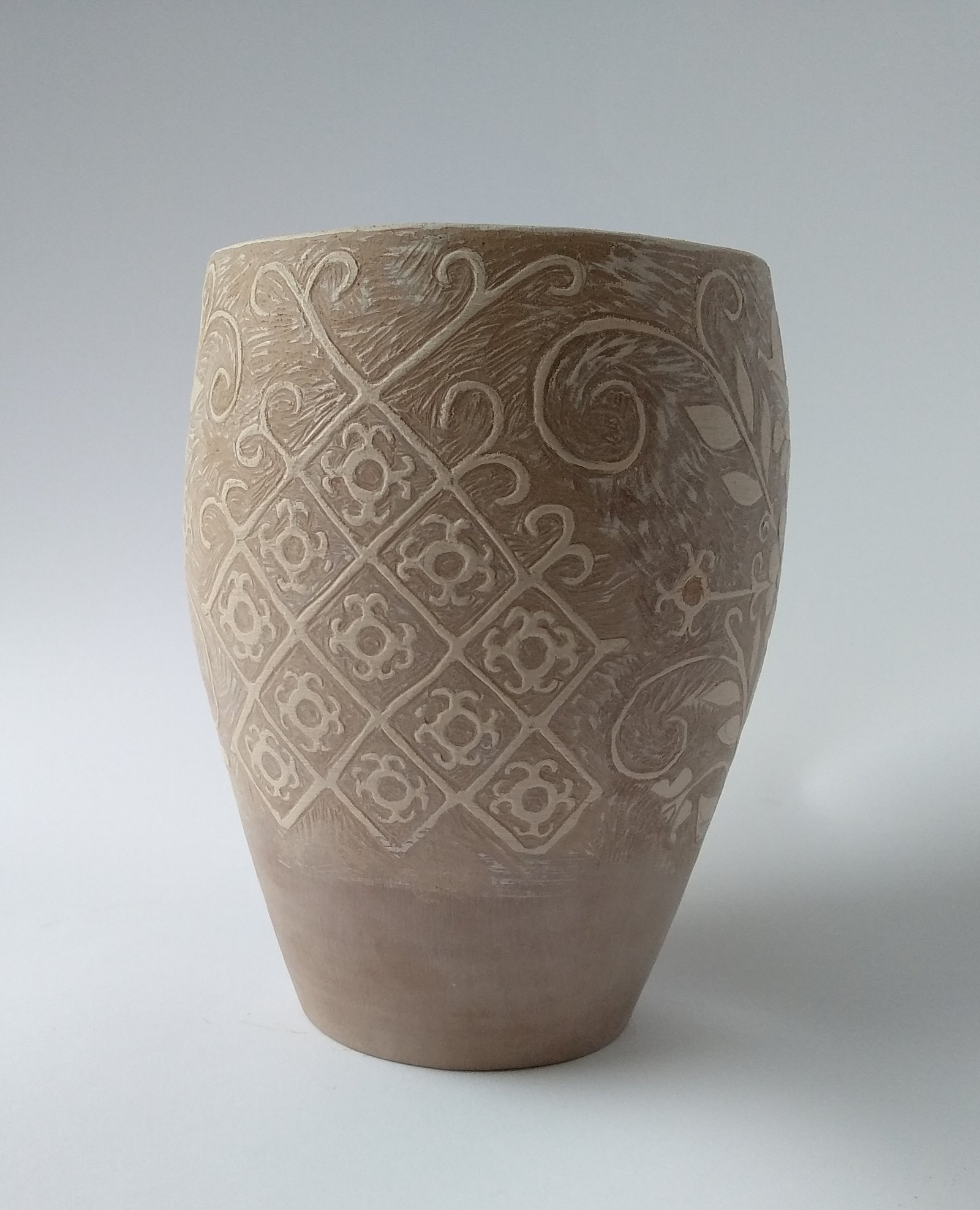 Adorn your space with this exquisitely carved vase, featuring intricate scrollwork and floral motifs against a warm, natural earthen tone. Perfect for showcasing dried botanicals or as a standalone decorative piece, it brings a touch of handmade elegance to any room.