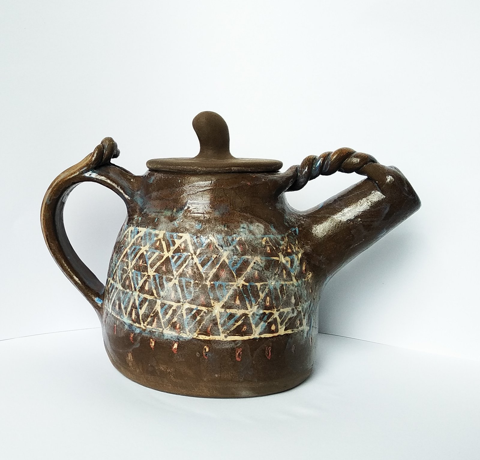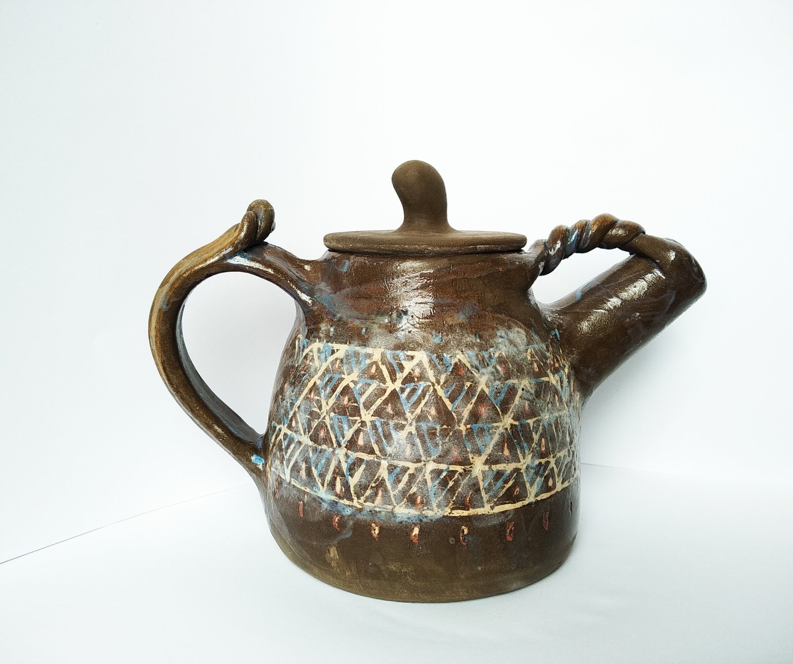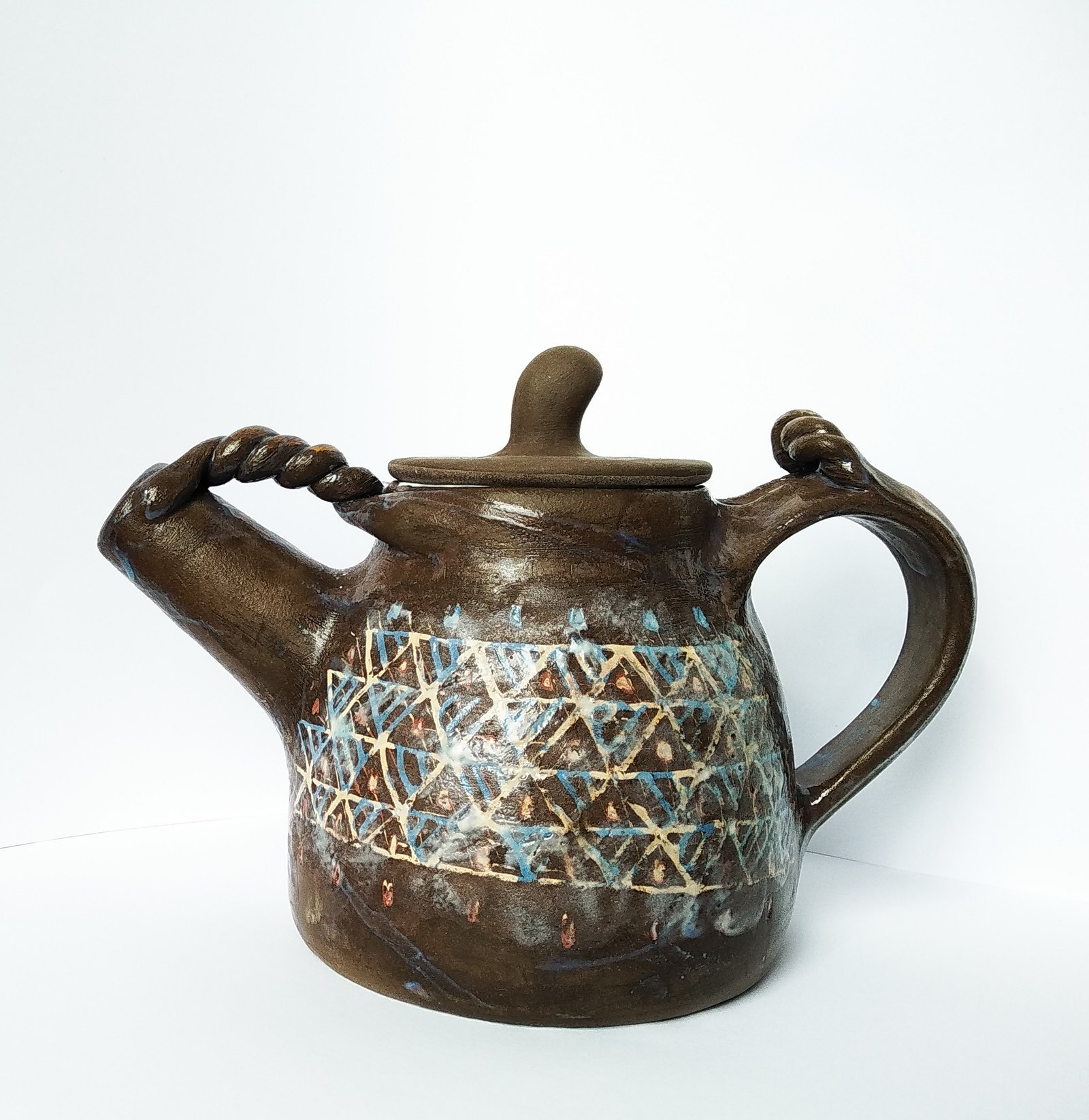 Brew your favorite tea in this unique handcrafted ceramic teapot, featuring a rich brown glaze complemented by an intricate geometric pattern in subtle blues and creams. Its sturdy design and artistic flair make it a beautiful and functional addition to any kitchen or tea collection.