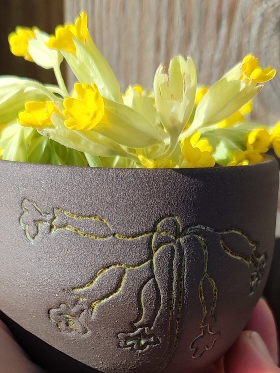 Discover the rustic charm of this dark stoneware bowl, adorned with delicate carved floral patterns that seem to sprout from its earthy surface. Perfect for displaying small plants, holding trinkets, or simply adding a touch of natural artistry to your home.