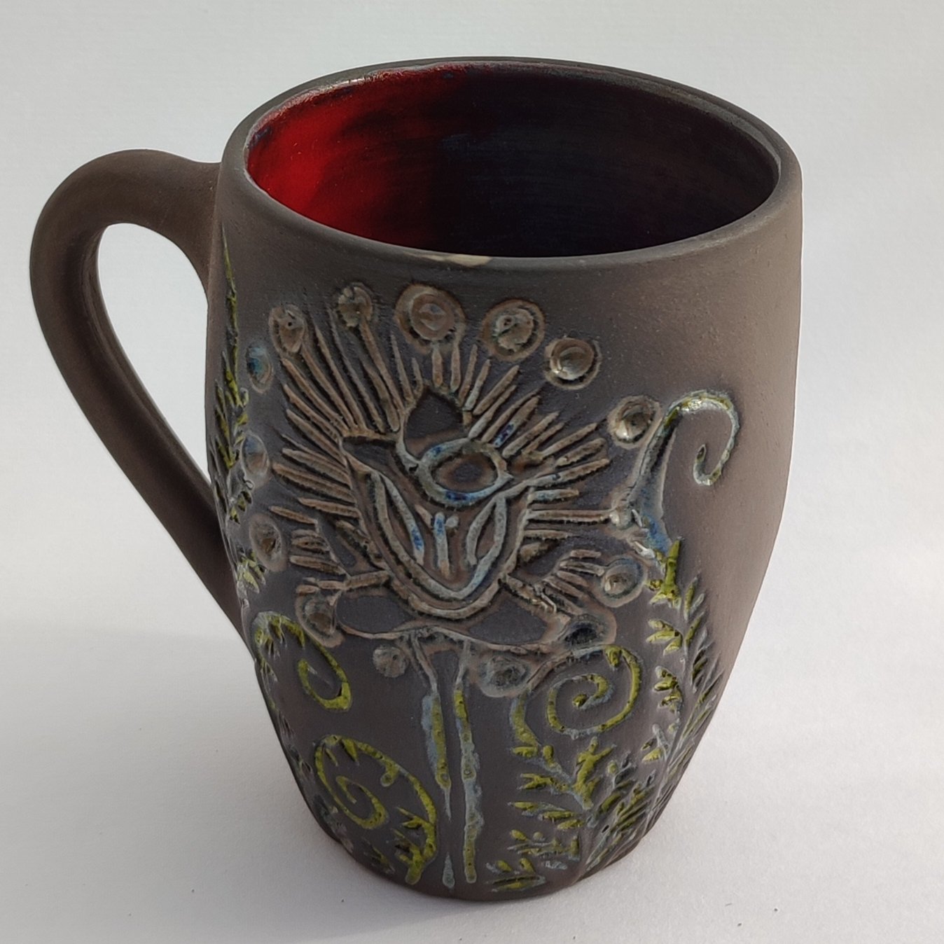 Sip your favorite beverage from this enchanting mug, featuring a rich, dark exterior adorned with an intricate, incised floral design. Its vibrant red interior provides a striking contrast, making every coffee or tea moment a delightful experience.