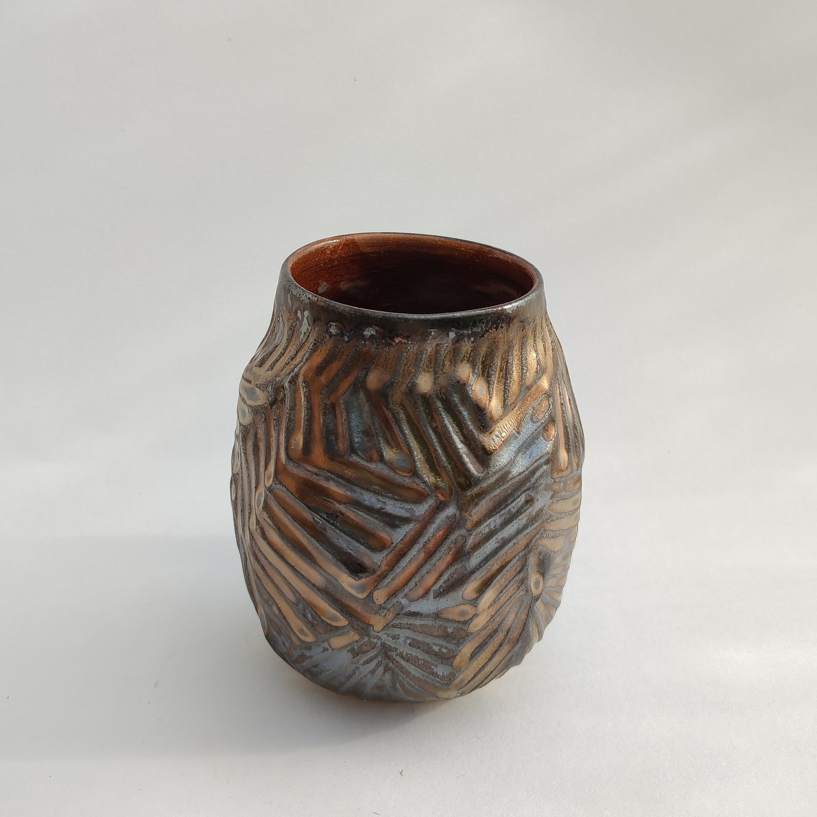 This captivating ceramic vessel features an intricate, carved pattern beneath a mesmerizing iridescent glaze, shifting between warm bronze, deep brown, and subtle hints of metallic blue. Perfect as a unique decorative vase or a statement piece, its rich texture and reflective surface add an earthy yet sophisticated touch to any space.