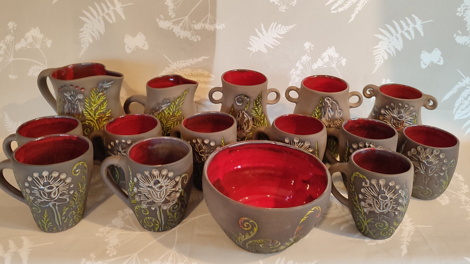 Sip your favorite beverage from this unique, hand-crafted botanical mug. Featuring a striking deep red interior and earthy grey exterior with intricate green and silver nature-inspired carvings, it brings a touch of rustic charm to your daily ritual.