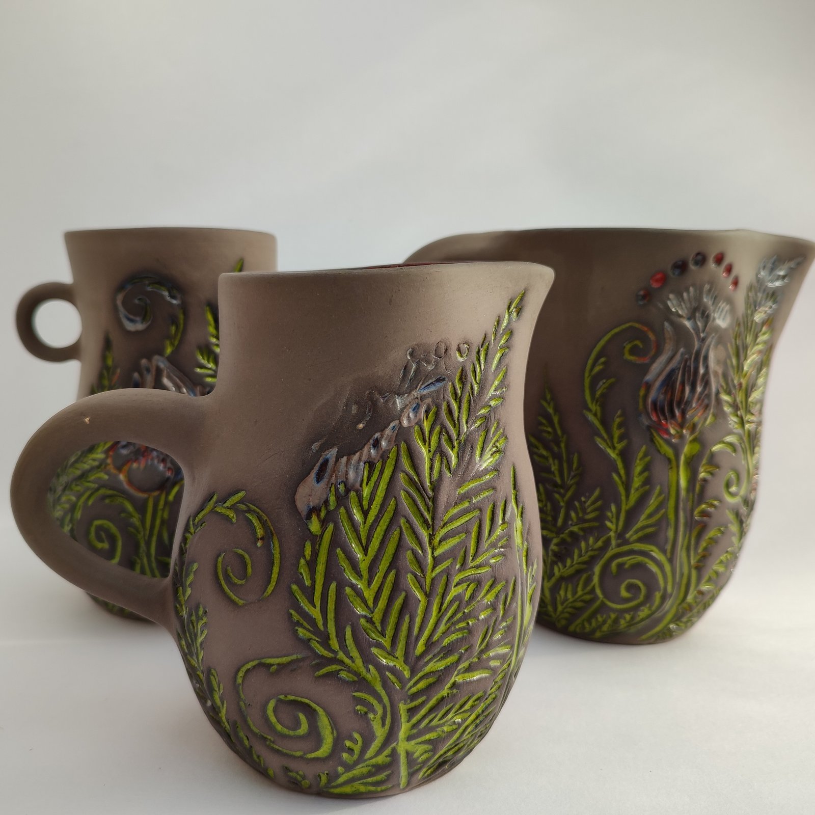 Sip your favorite drink from this beautifully crafted mug, featuring an intricate embossed fern design that wraps around its earthy brown surface. Each detail is brought to life with vibrant green glaze, inviting a piece of the serene forest into your home.