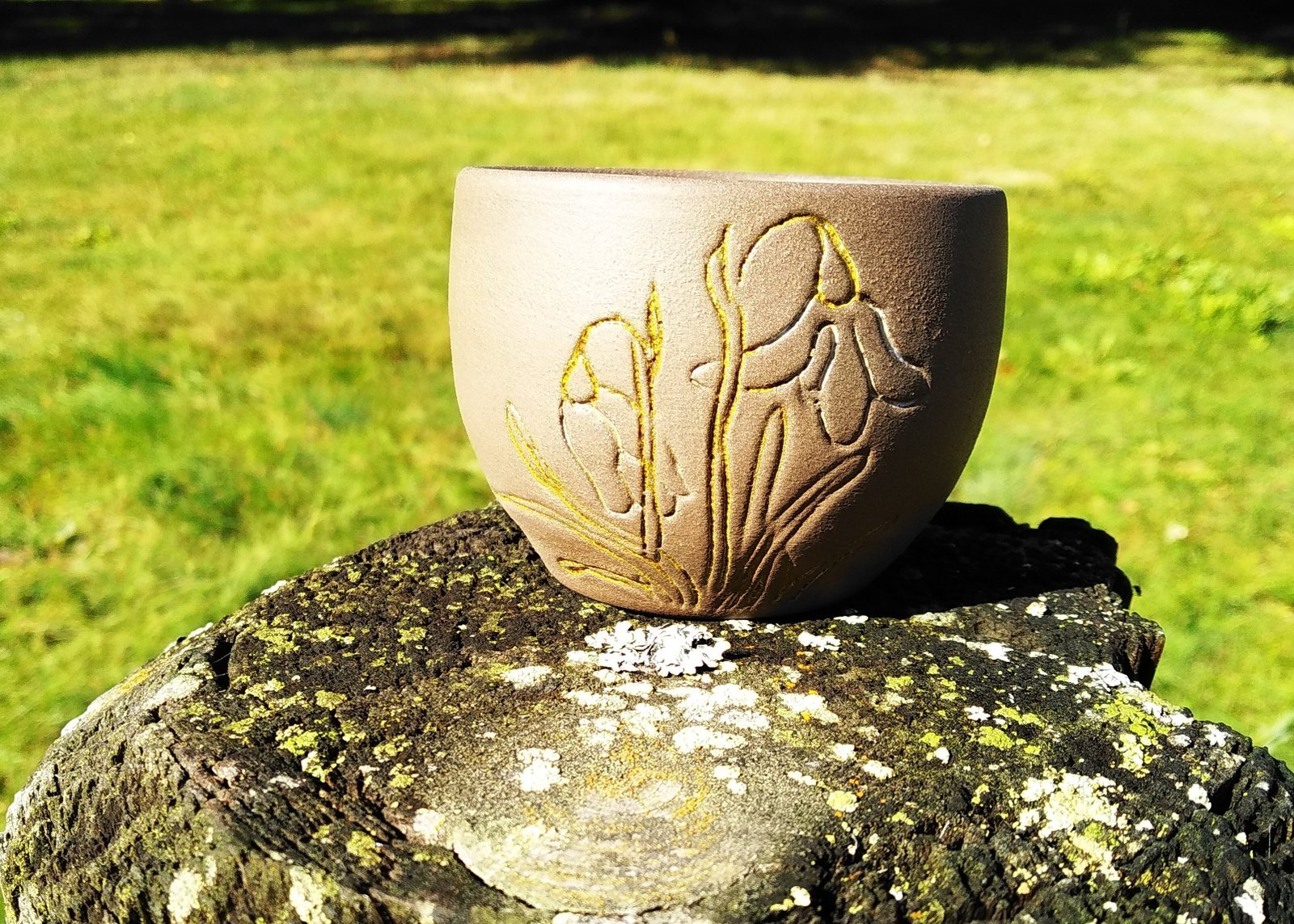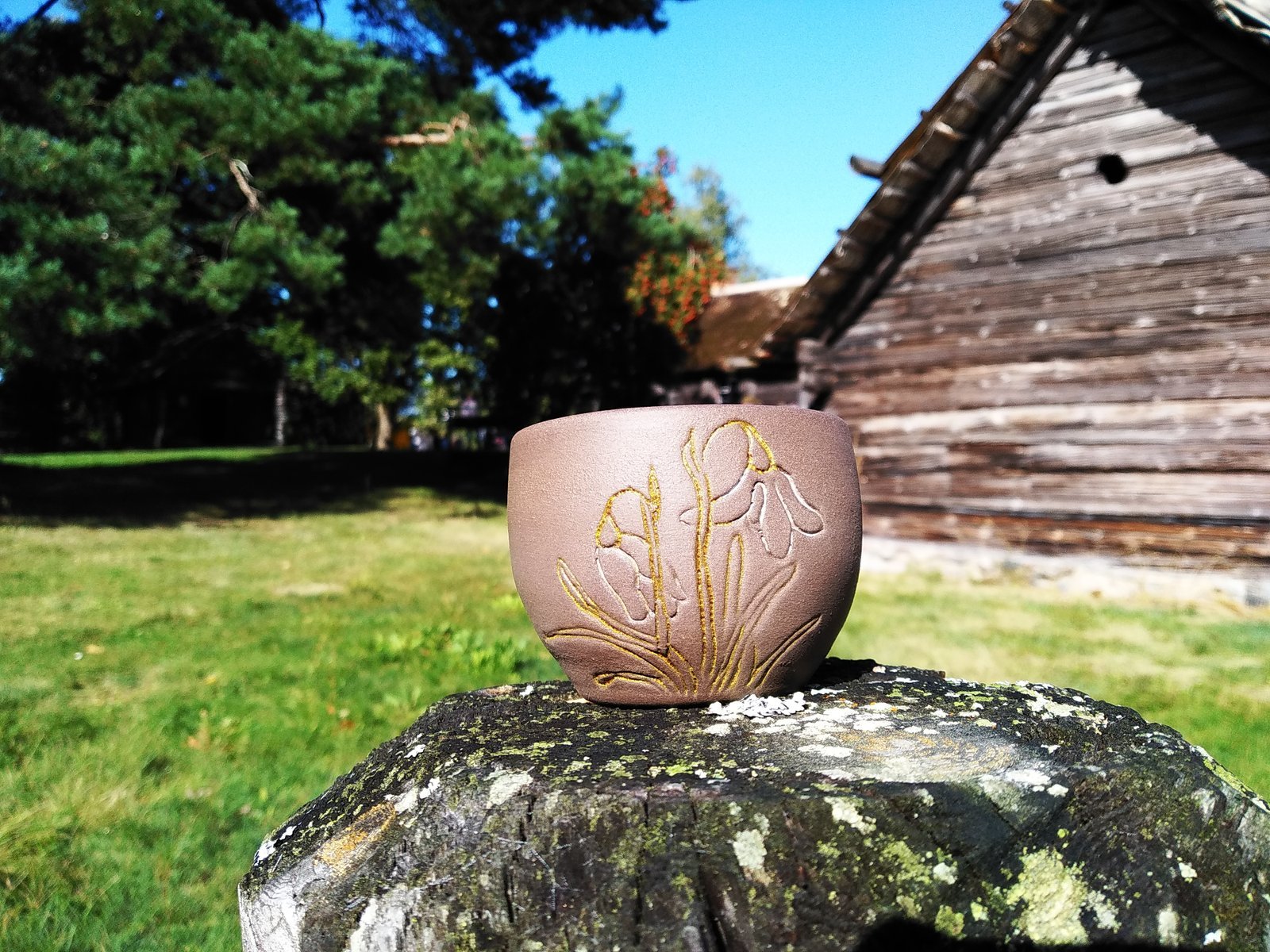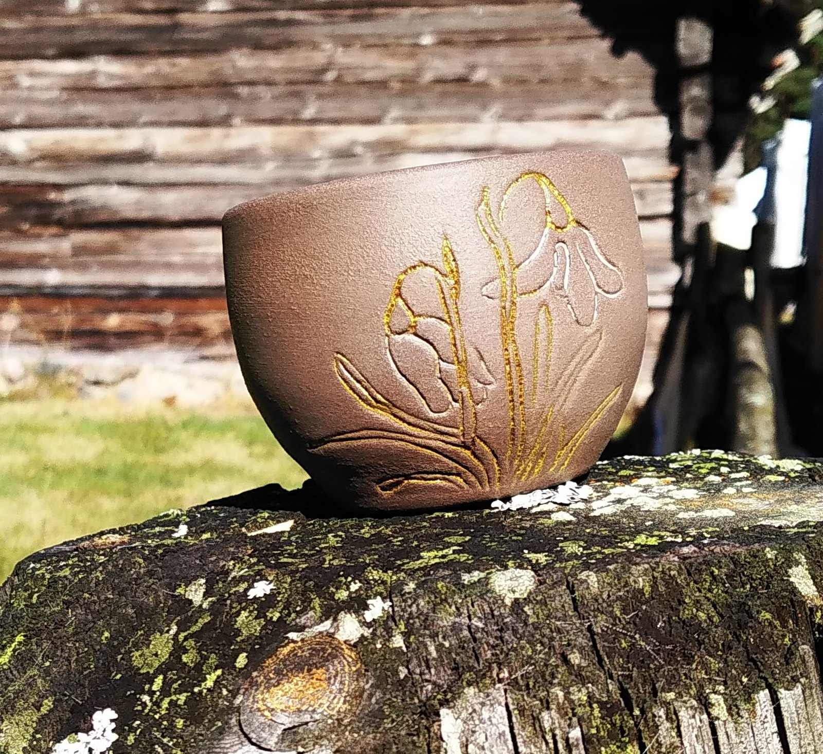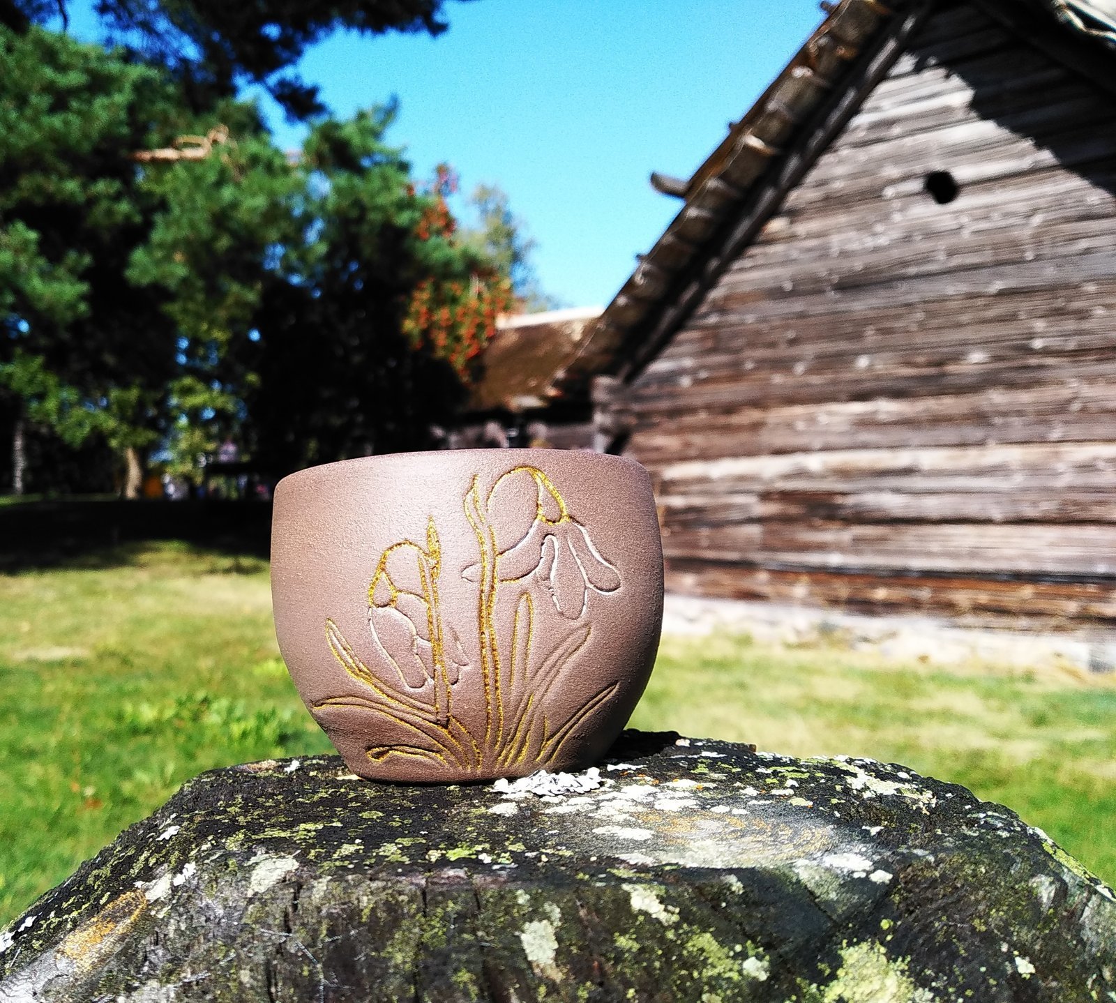 Discover the tranquility of nature with this charming clay tumbler, featuring delicate floral engravings highlighted in a subtle golden hue. Its earthy tone and sturdy design make it perfect for a serene tea experience or as a unique decorative piece.