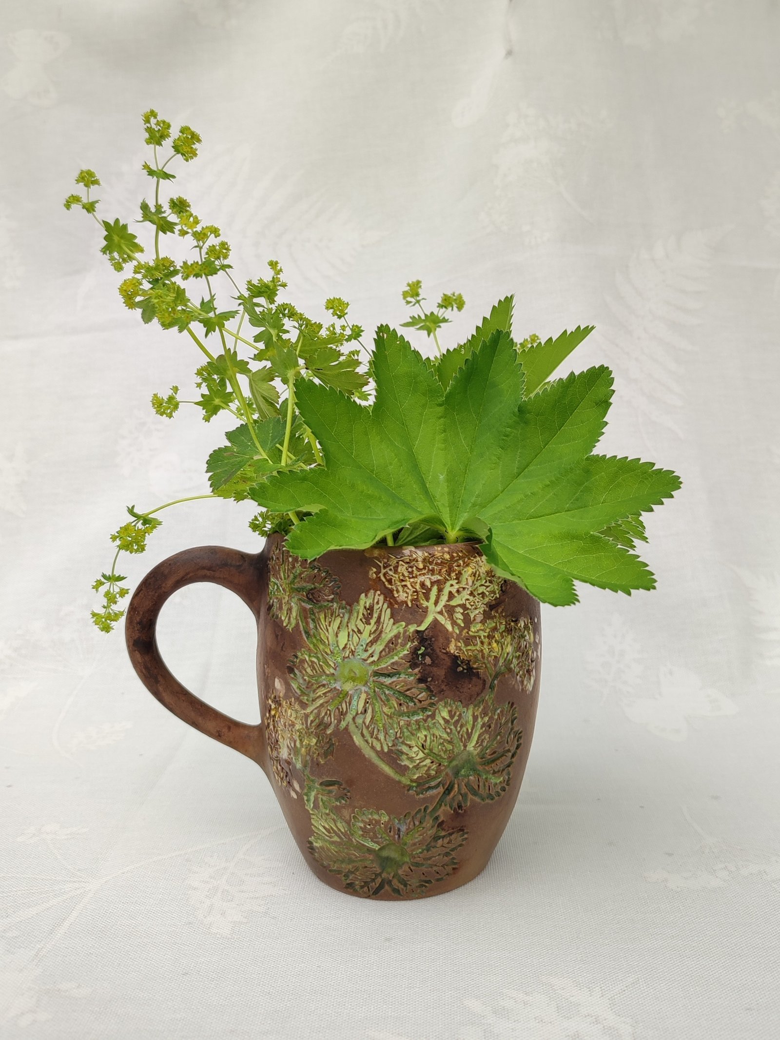Embrace the tranquility of nature with this unique ceramic mug, featuring a rich earthy brown base complemented by vibrant green, raised botanical textures. Its handcrafted design brings a touch of woodland charm and a tactile experience to your daily beverage ritual.