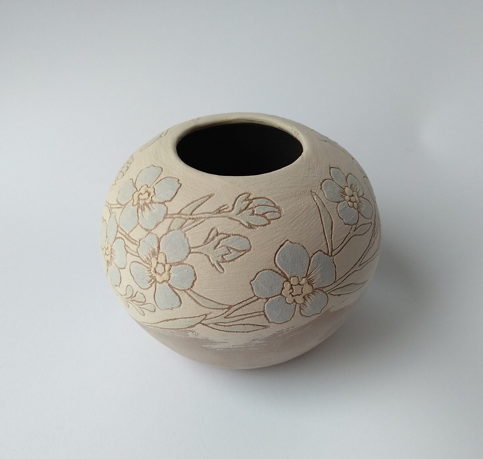 Adorn your space with this charming rounded vase, featuring delicate hand-carved floral patterns in a soft pale blue and beige palette. Its unique texture and inviting design make it a perfect centerpiece for small bouquets or a beautiful decorative object on its own.