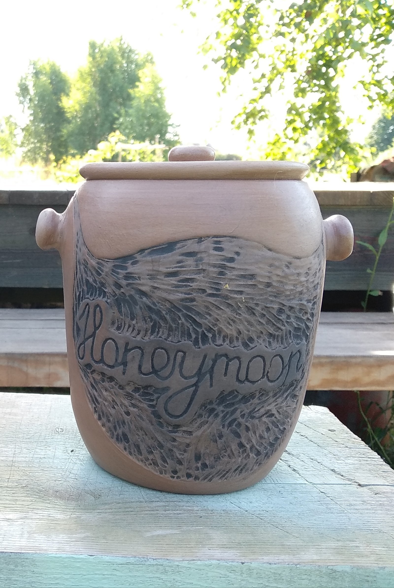 This handcrafted jar offers a unique touch to any space. Its rustic charm and intricate carved design makes it a memorable piece.