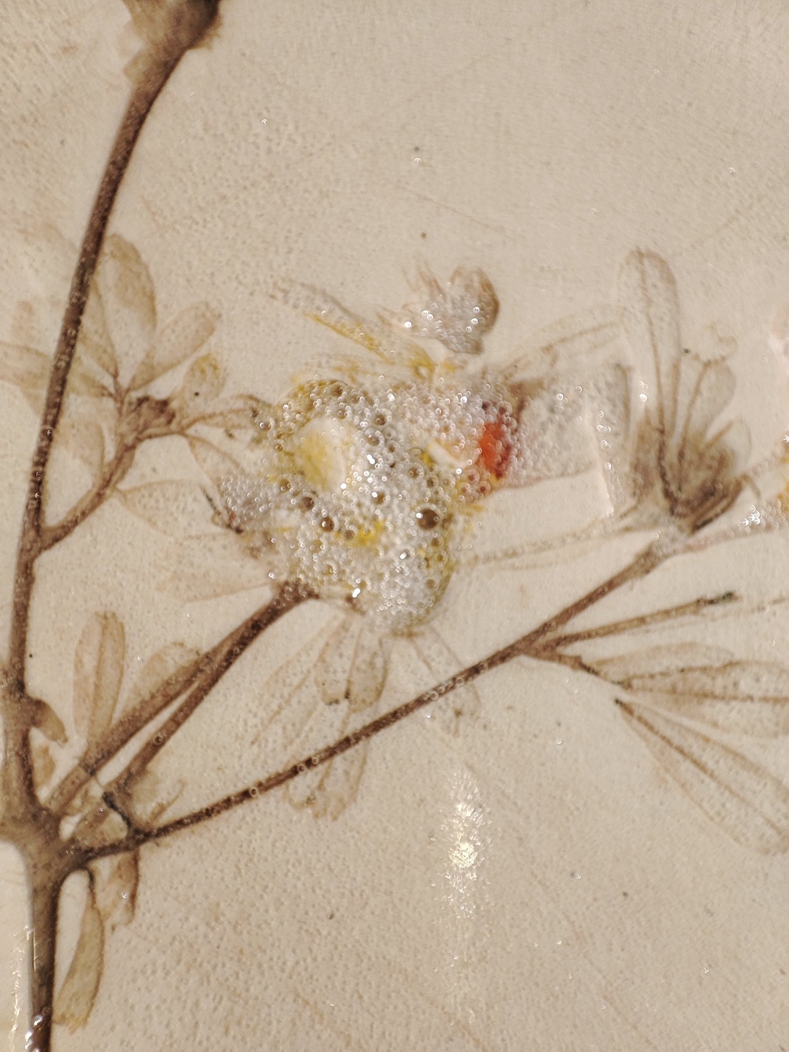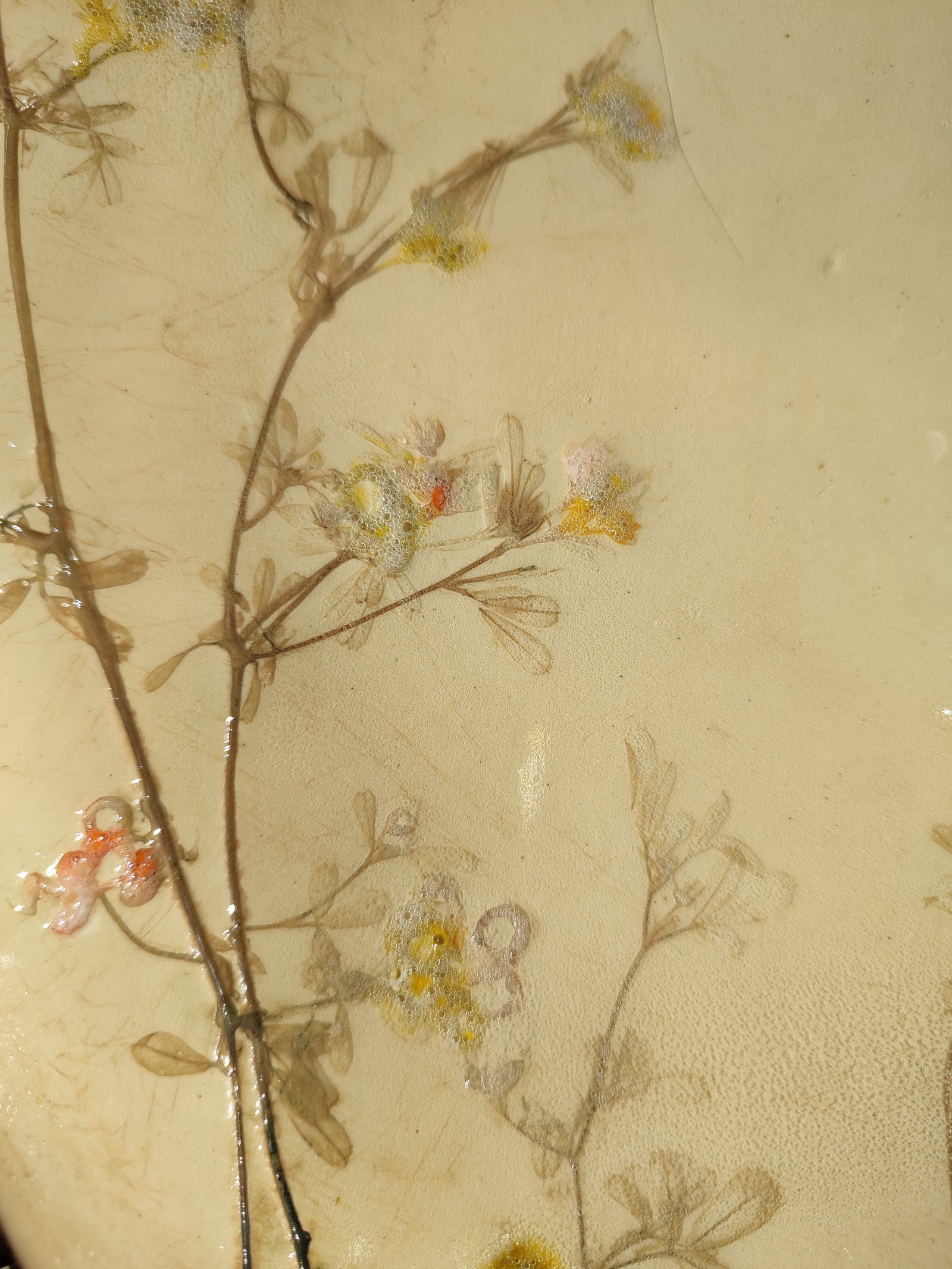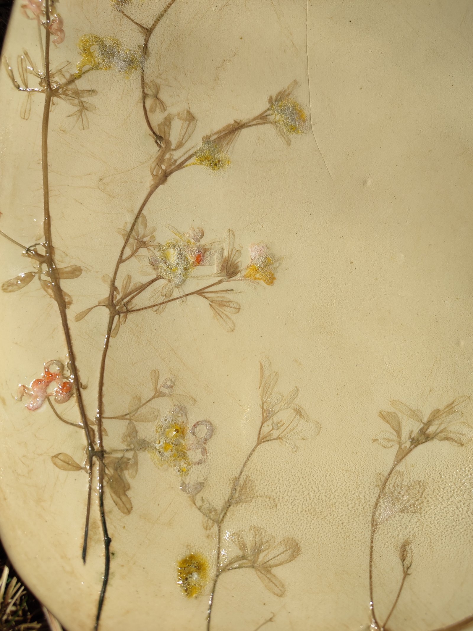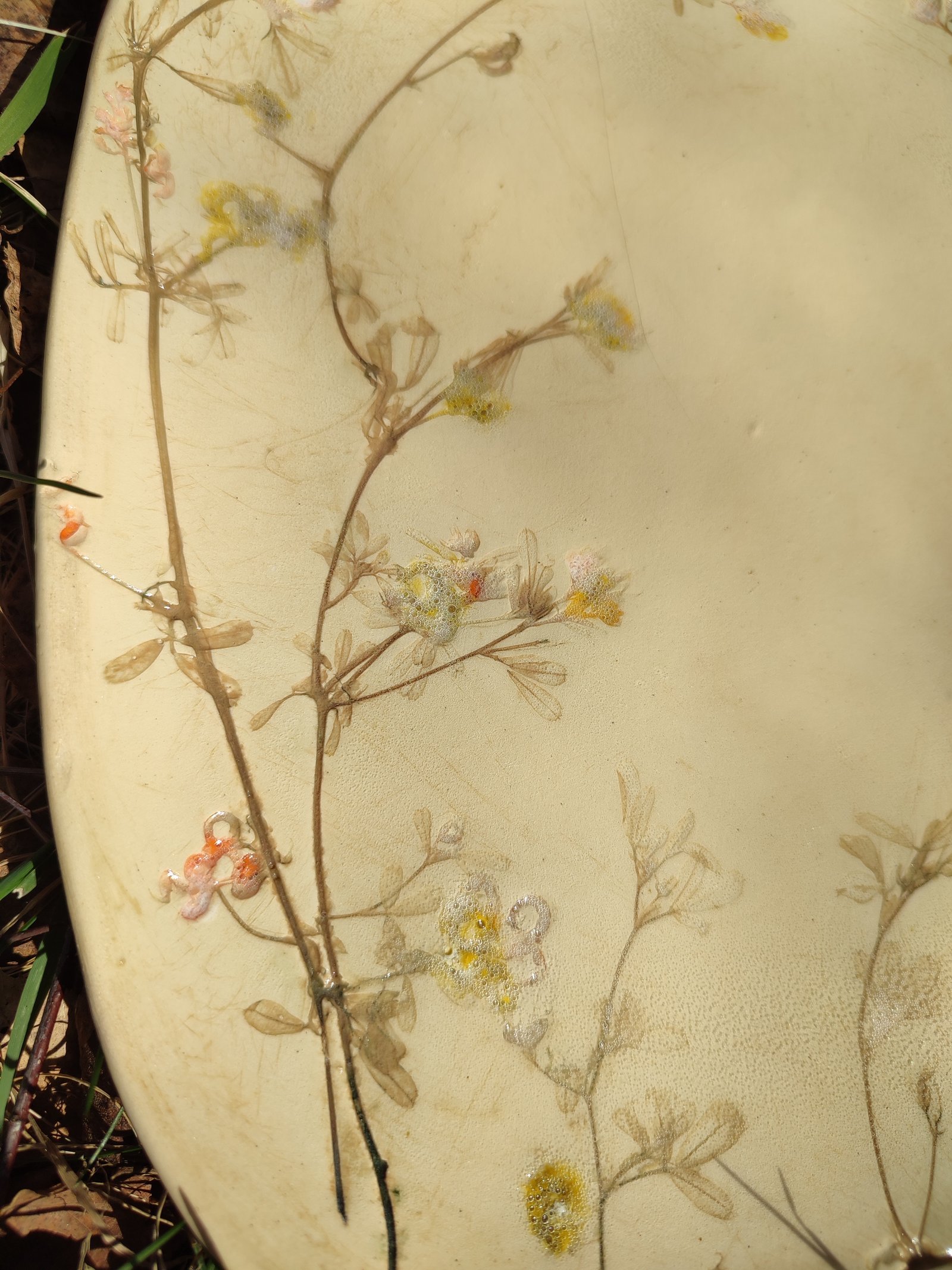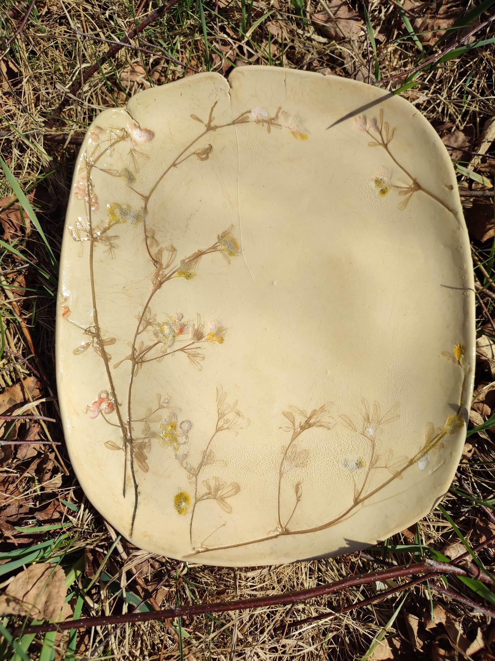 This exquisite plate captures the delicate beauty of nature with intricately impressed botanical patterns and subtle color accents. Its earthy beige hue and textured surface make it a unique and charming addition to any home decor or dining experience.