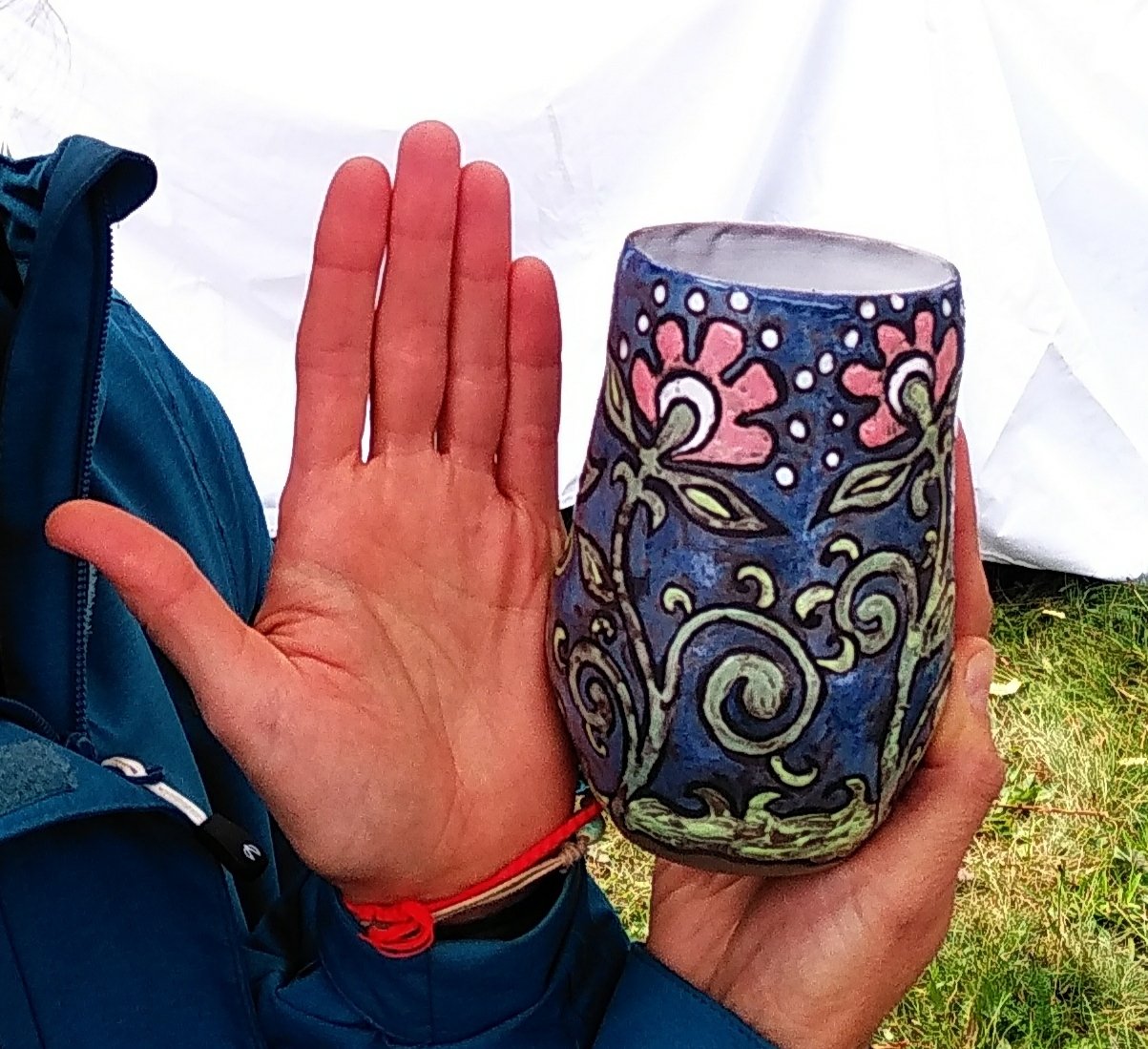 Sip in style with this enchanting hand-painted tumbler, featuring vibrant pink blossoms and winding green vines against a deep blue background. Its unique, organic design and textured surface make it a delightful addition to any collection or a charming gift for nature lovers.