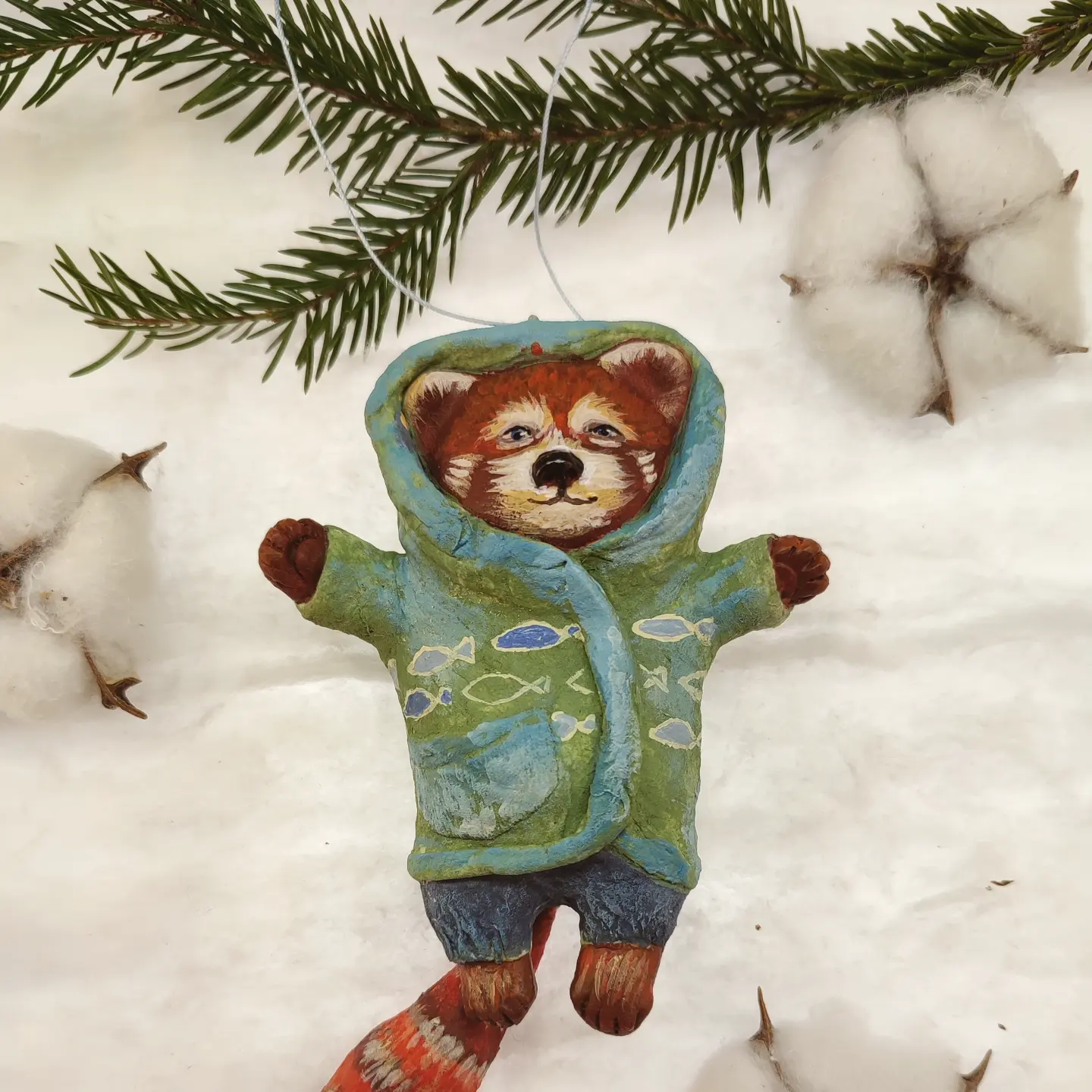 This charming handcrafted ceramic ornament features an adorable red panda bundled in a vibrant blue and green jacket, complete with playful fish patterns. Perfect for adding a unique and heartwarming touch to your holiday decor or as a delightful year-round accent for animal lovers.