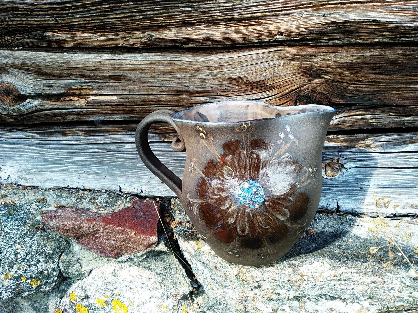 This charming pottery pitcher features a rich, dark brown glaze adorned with an intricate hand-painted floral motif, highlighted by a vibrant blue center. Its sturdy design and folk-art appeal make it perfect for serving or as a beautiful decorative accent in any rustic or bohemian setting.