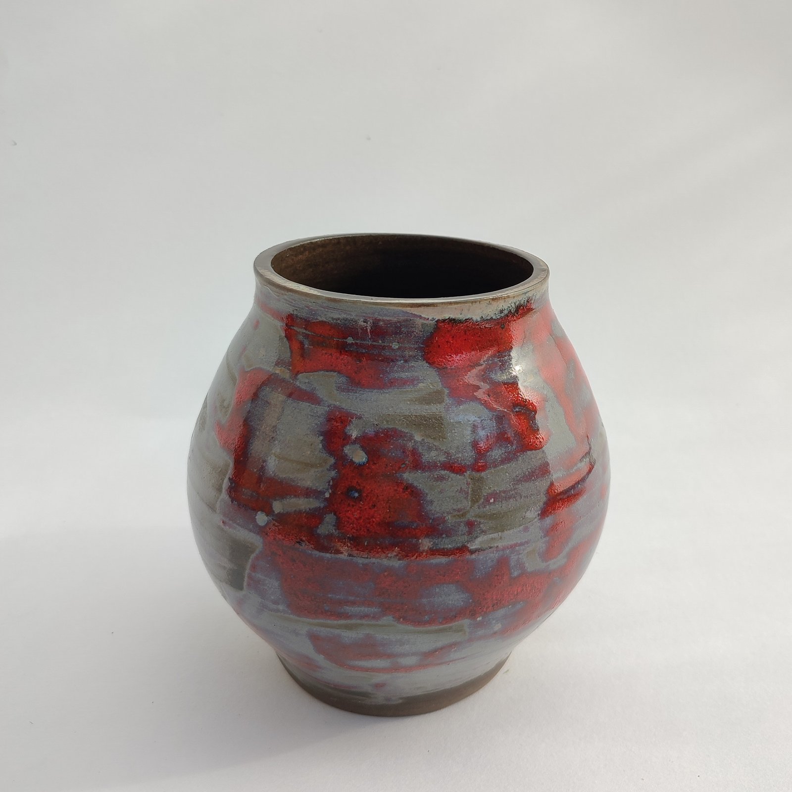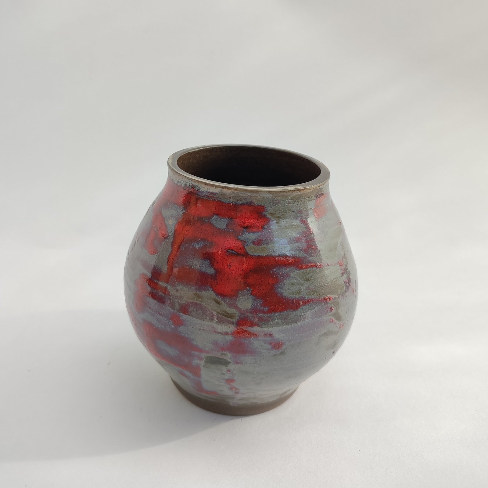 This stunning vase features a unique, hand-carved texture resembling natural formations, brought to life by a captivating multi-tonal glaze. Its iridescent finish transitions between earthy browns, deep blues, and shimmering bronzes, making it a striking centerpiece for any decor.