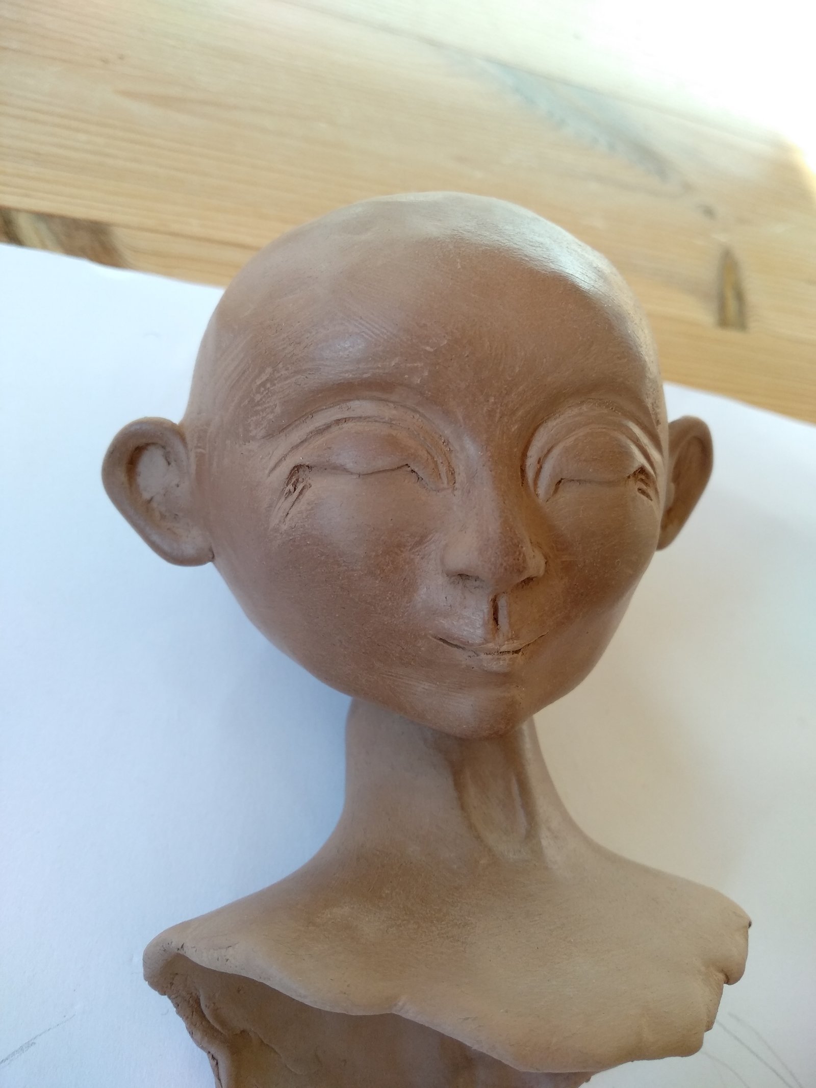This handcrafted clay bust captures a moment of serene contemplation, featuring gently closed eyes and a peaceful expression. Left unglazed, the natural terracotta highlights its earthy texture, making it a unique artistic addition to any decor.
