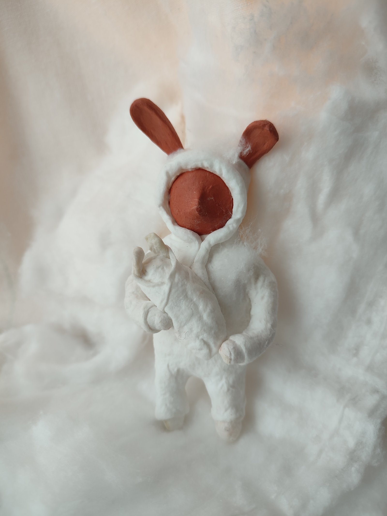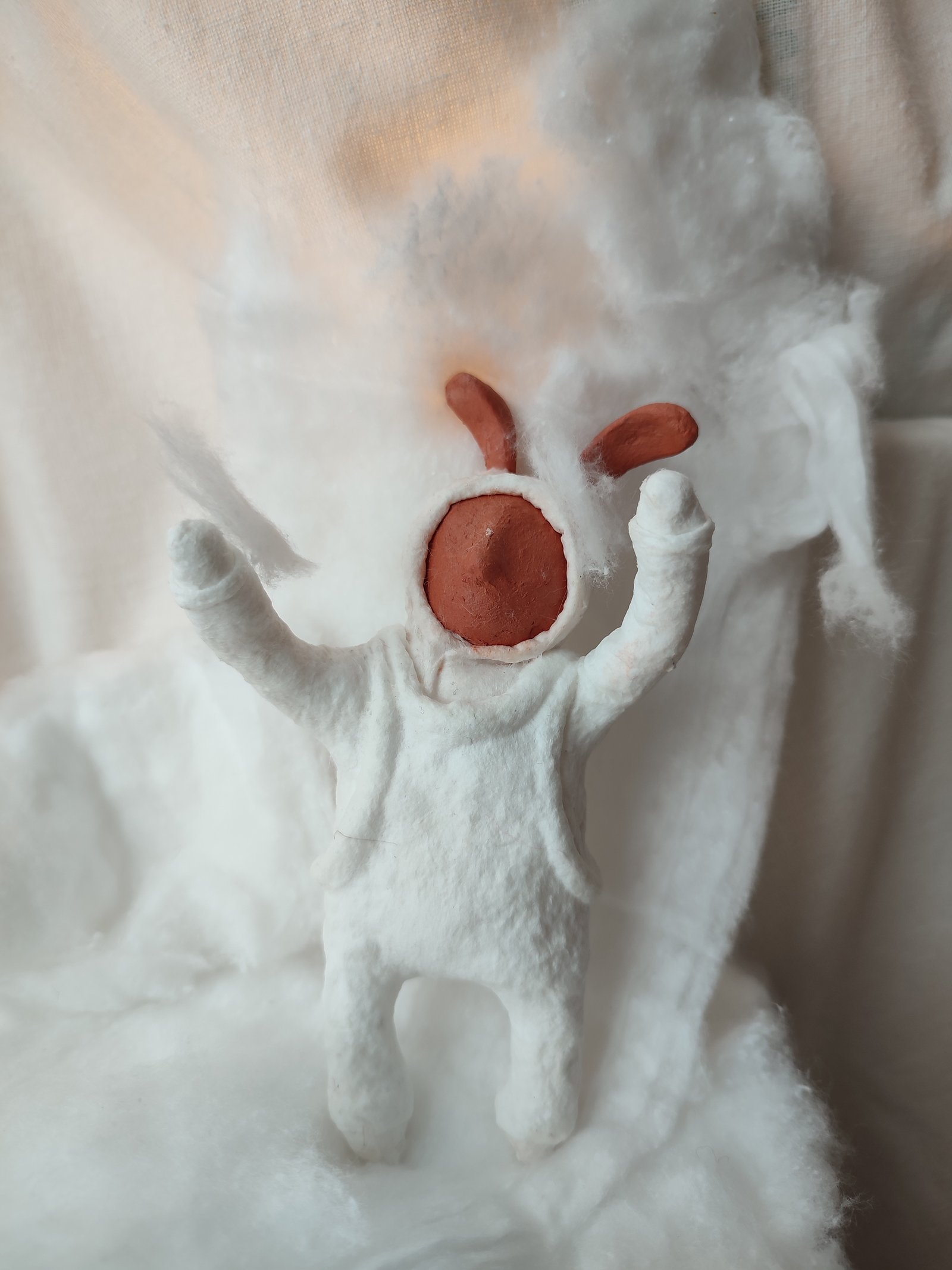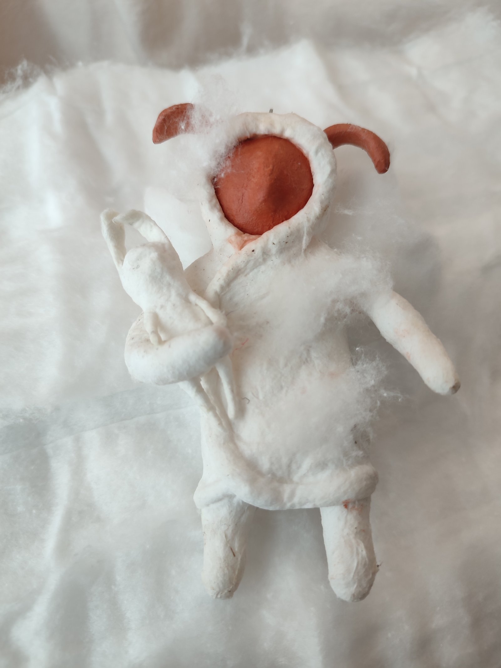 Embrace the warmth and charm of ‘The Fluffy Wanderer,’ a whimsical clay figurine enveloped in soft, snow-like fibers. This handcrafted piece, with its gentle expression and mysterious allure, makes a perfect addition to any cozy nook or shelf.