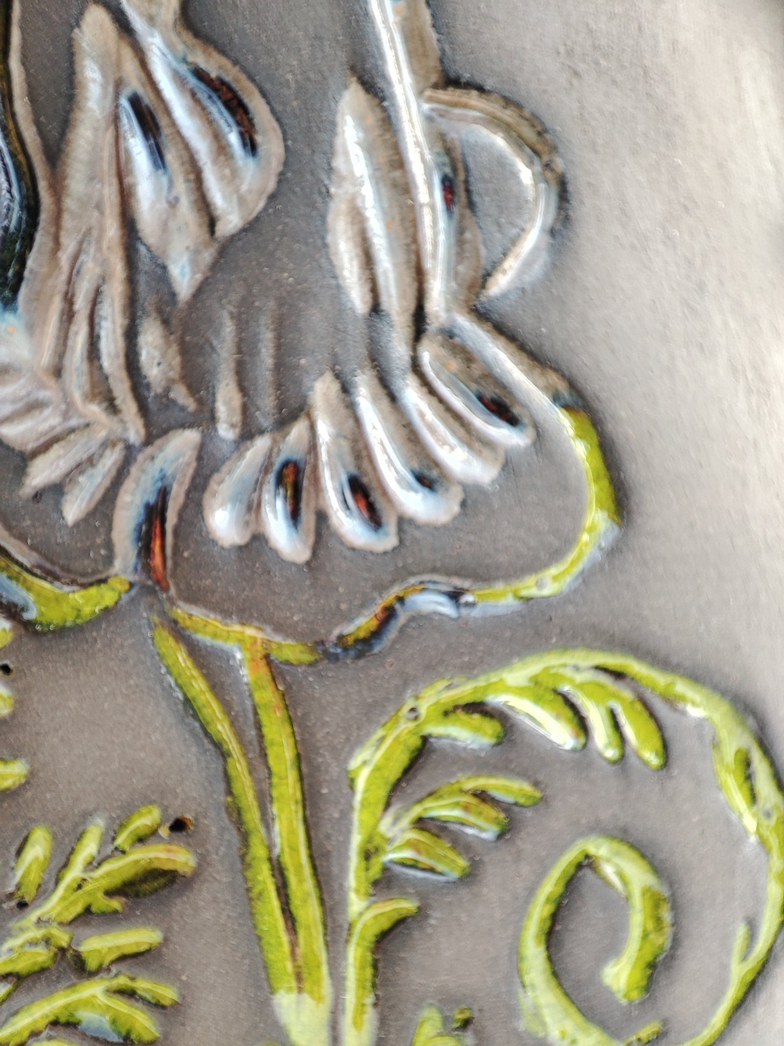 This exquisite ceramic tile features an intricate embossed botanical design, highlighted by a vibrant verdant green glaze over a rich, textured grey base. Perfect for adding a touch of natural elegance and Art Nouveau charm to any interior space or decorative project.