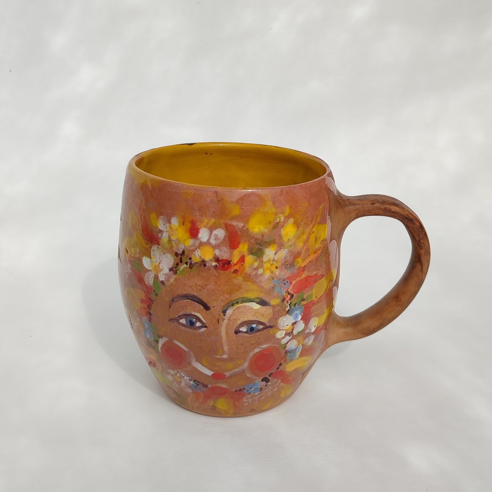 Brighten your mornings with this unique, hand-painted mug featuring a cheerful sun face surrounded by vibrant blossoms. Its rustic charm and colorful details make it a delightful addition to any collection or a thoughtful gift.