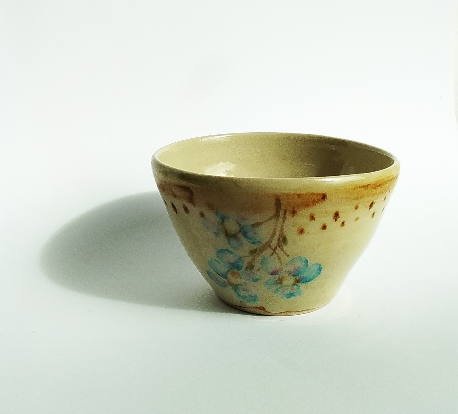 This charming handcrafted ceramic cup features delicate hand-painted blue floral motifs on a warm beige background, evoking a serene, natural aesthetic. It’s perfectly sized for your favorite tea, a small dessert, or as a quaint decorative piece.