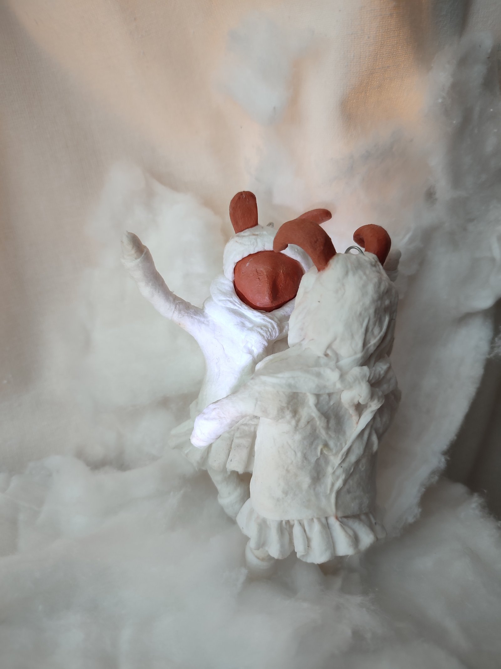 These heartwarming figurines depict two figures in a gentle embrace, crafted with expressive terracotta clay features and draped in soft, textured white material. Perfect for adding a touch of rustic charm and whimsical artistry to your home, they evoke feelings of warmth and companionship.